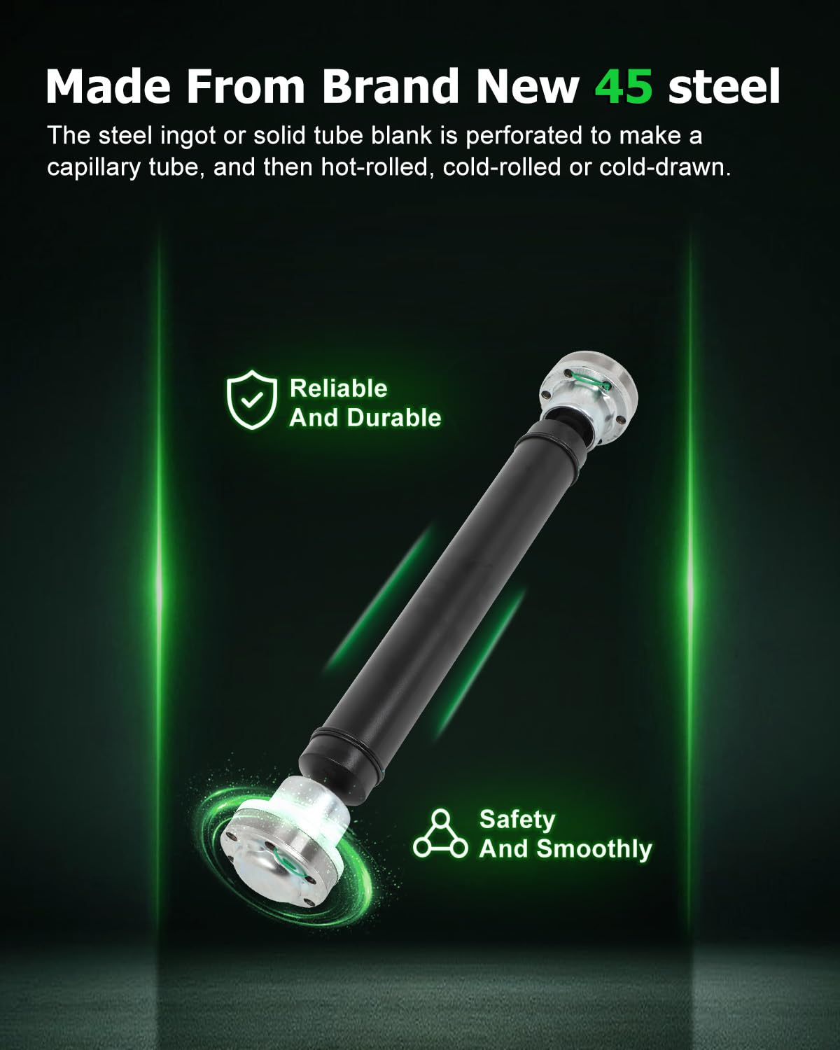 Q: What are the specifications of the SCITOO Drive Shaft?A: This drive shaft has a total length of 25.375 inches, a shaft diameter of 2.5 inches, and a wall thickness of 0.065 inches. It meets high precision and strength standards for optimal performance.
