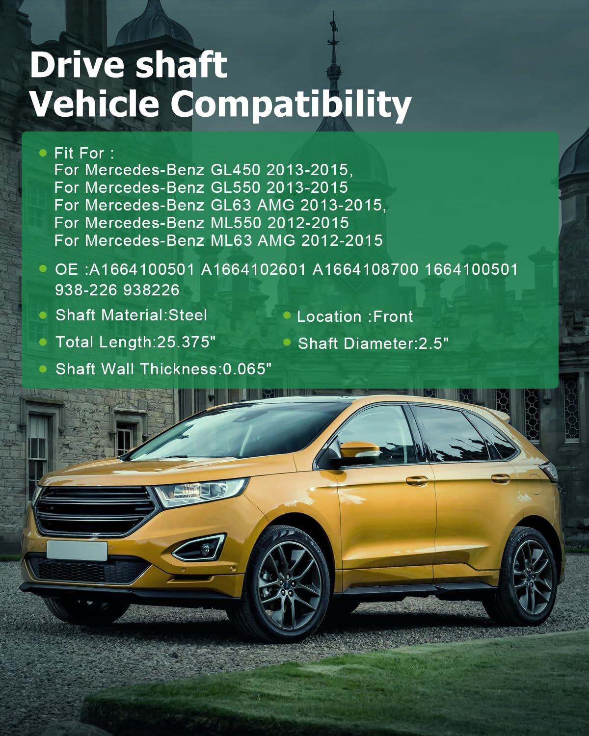 Q: What vehicles are compatible with the SCITOO Steel Front Driveshaft Assembly?A: The SCITOO Steel Front Driveshaft Assembly is compatible with several Mercedes-Benz models, including the GL450 (2013-2015), GL550 (2013-2015), GL63 AMG (2013-2015), ML550 (2012-2015), and ML63 AMG (2012-2015). Ensure your vehicle has AWD for proper fit.