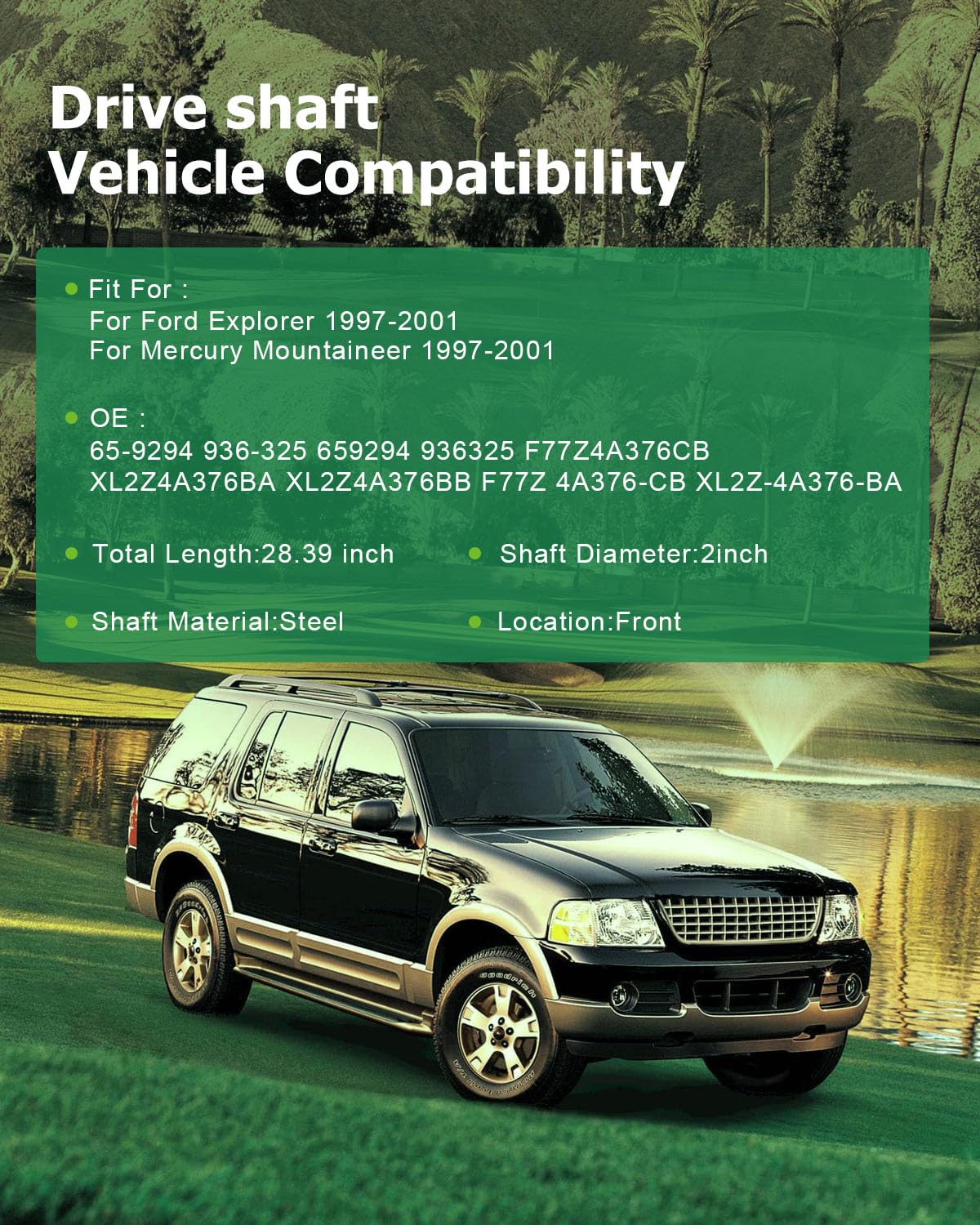 Q: What vehicles are compatible with the SCITOO 28.39" Front Drive Shaft Assembly?A: The SCITOO 28.39" Front Drive Shaft Assembly is compatible with Ford Explorer models from 1997 to 2001 (both 4.0L and 5.0L engines) and Mercury Mountaineer models from 1997 to 2001 (both 4.0L and 5.0L engines). Please verify the year, make, and model of your vehicle using the part finder tool to ensure compatibility.