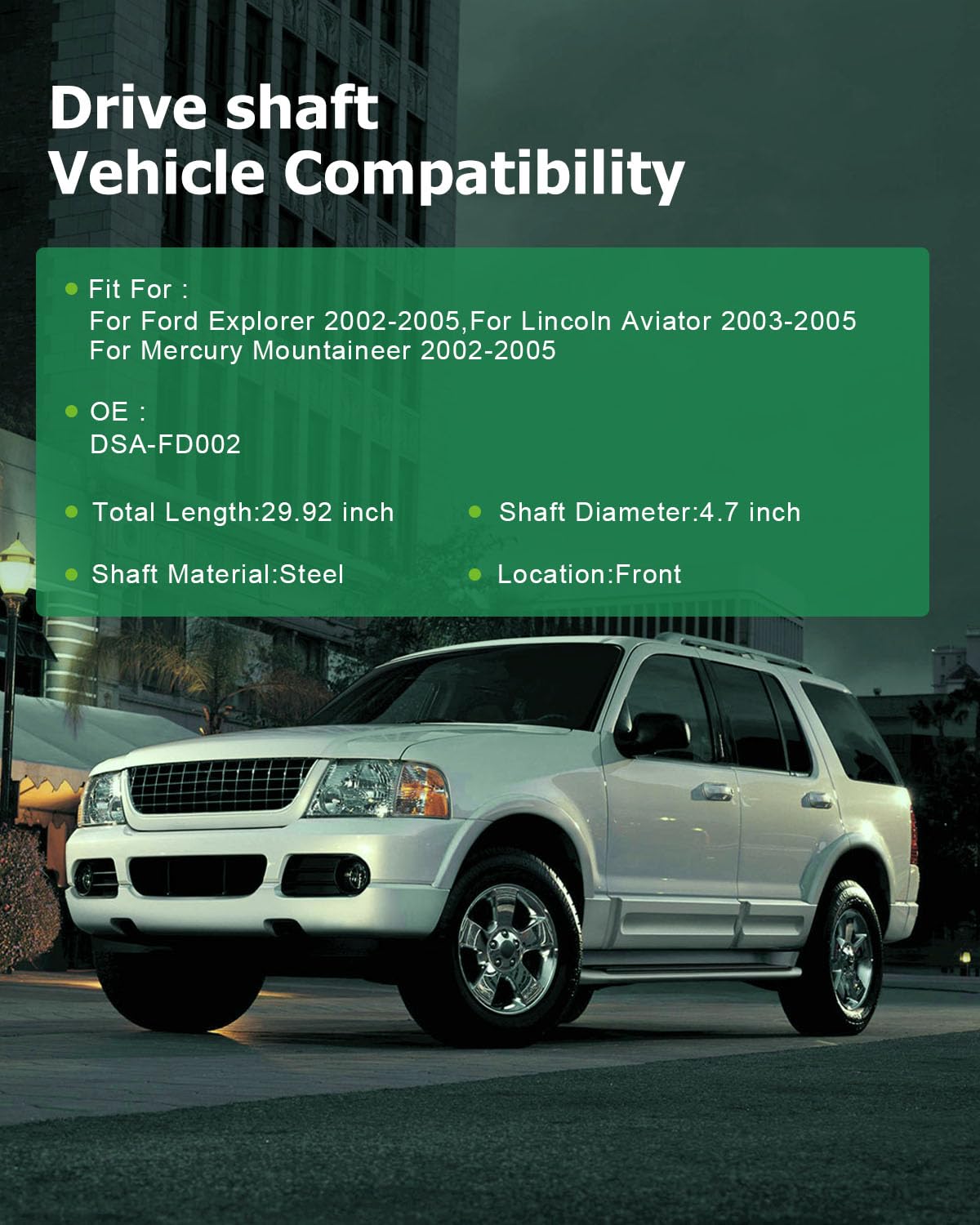 Q: What vehicles are compatible with the SCITOO Front Drive Shaft Assembly?A: The SCITOO Front Drive Shaft Assembly is compatible with Ford Explorer models from 2002 to 2005, Lincoln Aviator models from 2003 to 2004, and Mercury Mountaineer models from 2002 to 2005. It's important to verify your vehicle's year, make, and model for compatibility.