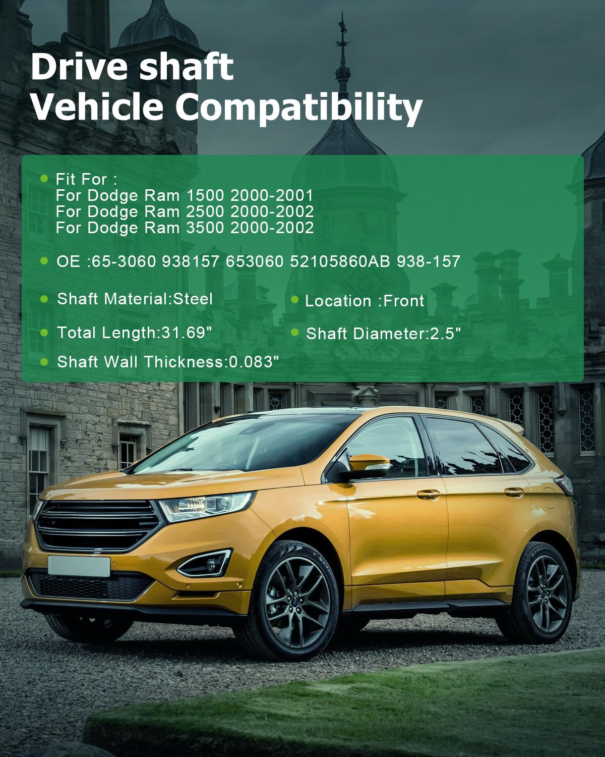 Q: What vehicles are compatible with the SCITOO Steel Front Driveshaft Assembly?A: The SCITOO Steel Front Driveshaft Assembly is compatible with Dodge Ram 1500 models from 2000 to 2001, Dodge Ram 2500 models from 2000 to 2002, and Dodge Ram 3500 models from 2000 to 2002, specifically designed for vehicles with 4WD and automatic transmission.