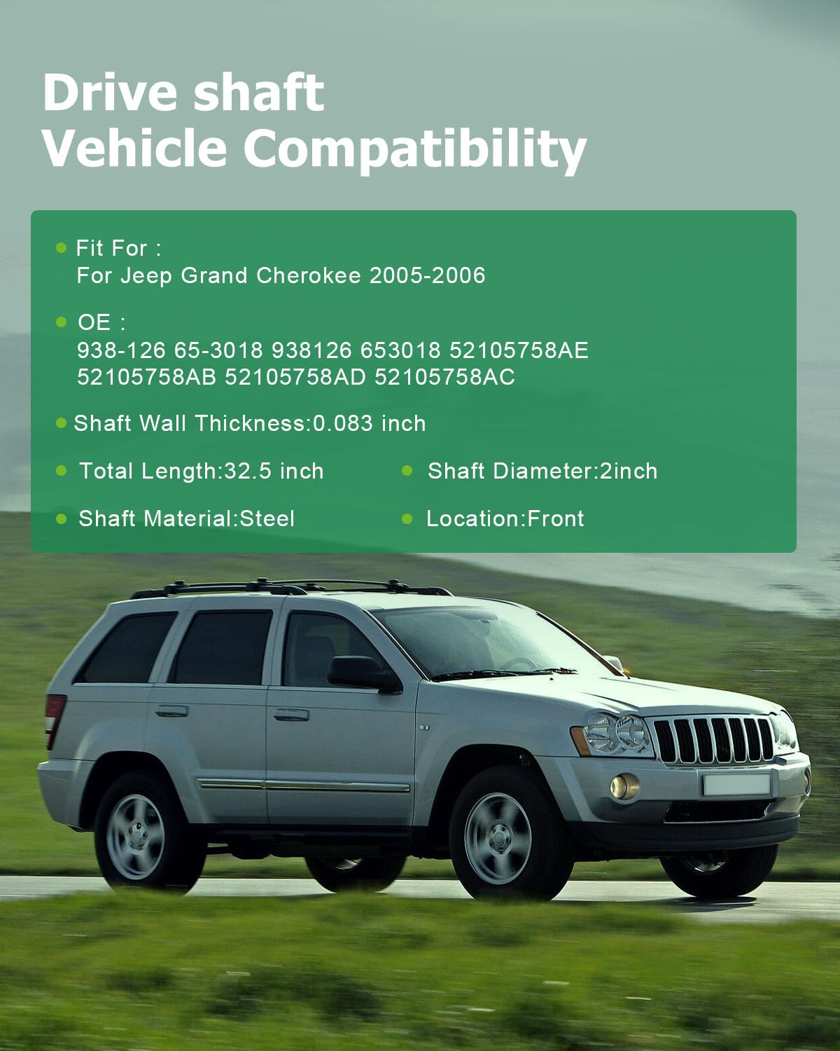 Q: Is the SCITOO 32.5" Front Drive Shaft Assembly compatible with my Jeep Grand Cherokee?A: Yes, the SCITOO 32.5" Front Drive Shaft Assembly is compatible with Jeep Grand Cherokee models from 2005 to 2006, specifically for the 3.7L and 6.1L engines. Please verify your vehicle's year, make, and model before purchasing.