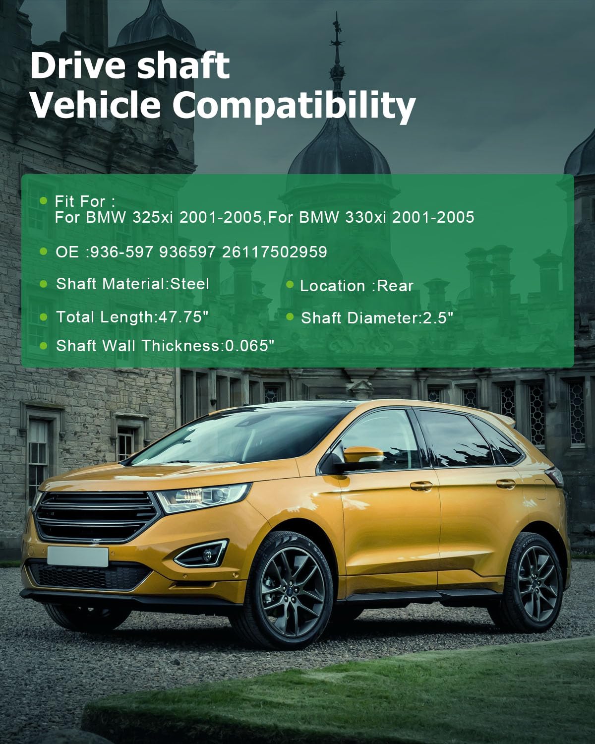 Q: Is this drive shaft compatible with my BMW 325xi or 330xi?A: Yes, this SCITOO Steel Rear Driveshaft Assembly is specifically designed for BMW 325xi models from 2001 to 2005 and BMW 330xi models from 2001 to 2005. It ensures a perfect fit and optimal performance.