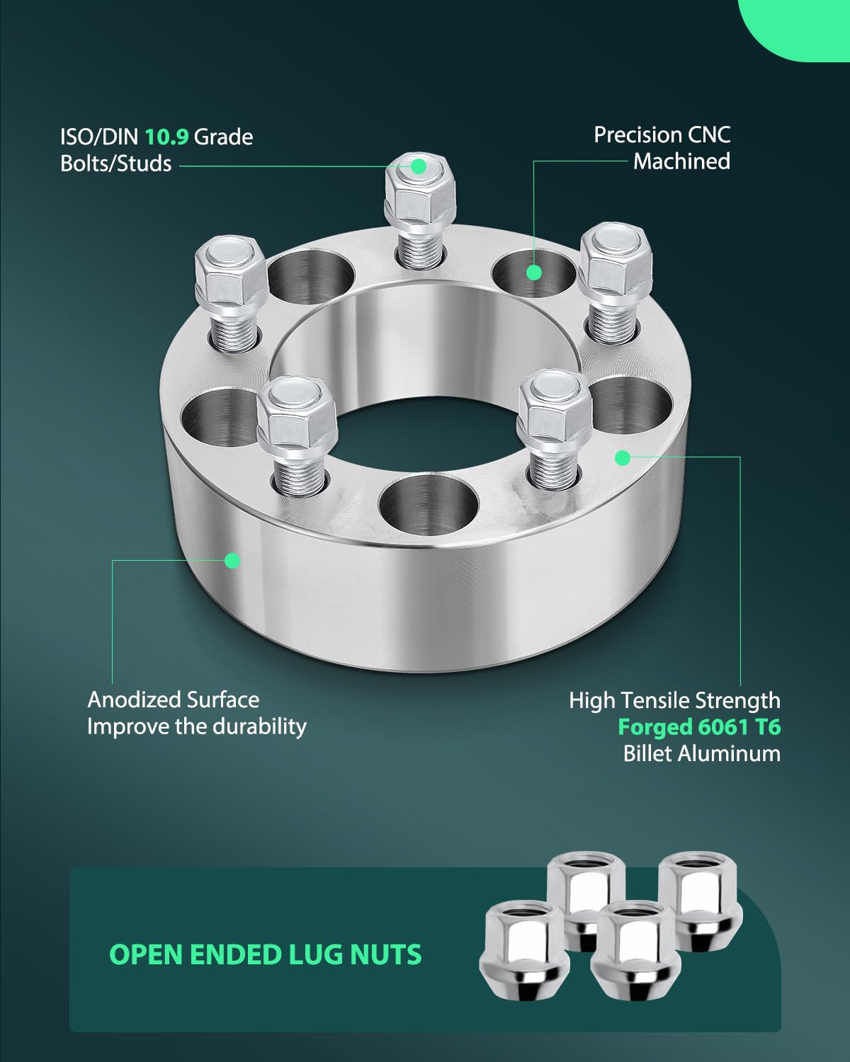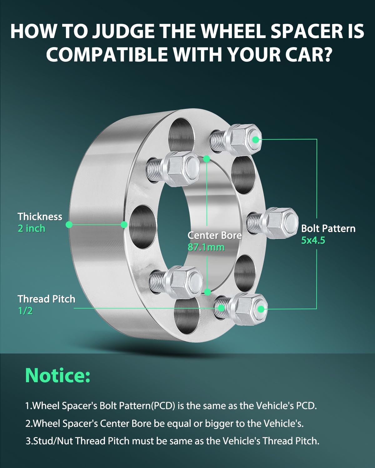 ???Pro-Spacer Kit?lug centric Wheel Spacers pieces allow more outboard placement of wheels to Increases the track width of your vehicle for an aggressive look that reduces gap between tire and fender, and more improved cornering and greater stability. | ???Compatible 5 lug 2 inch Wheel Spacers Adapter?WHEEL SPACERS 5 lug fit for 1986-1992 for Comanche wheel spacers 1992-2011 for Grand Marquis wheel spacers 1967-1973 for Cougar wheel spacers 2003-2004 for Marauder wheel spacers | ???2 inch 5x4.5 Wheel Spacer Kit ?SCITOO wheel spacer adapters will provide a 1 inch offset for factory wheels. The wheel spacer is not intended for wheels wider than 8 or aftermarket wheels with less than 4 of backspacing. Sold in Pairs. Maintains stock bolt pattern, and acts as an offset spacer only - 5x4.5'' to 5x4.5''.(2 inch hickness,5x114.3 or 5x4.5 vehicle bolt pattern,5x114.3 or 5x4.5 wheel bolt pattern,87.1mm Center bore,1/2''x20 Studs) | ???WHEEL SPACERS 5X114.3 TO 5X114.3 Function?Made with hot forged aircraft grade aluminum with strength to weight ratio exceeding steel. Meanwhile Forged heat-treated and hardened ISO/DIN 10.9 studs deliver strength.Straight knurled edges for improved grip during install. | ???5x4.5 SPACERS ATTENTION?Precision Engineered and Model Specific for Perfect Fit and Wheel Balance . Package contains: 2 pcs wheel spacers 5x4.5+ 10 wheel bolts