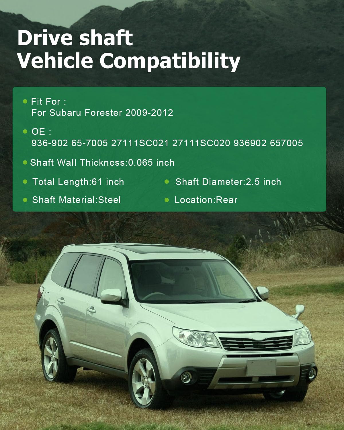 Q: Is the SCITOO 61" Rear Drive Shaft Assembly compatible with my Subaru Forester?A: Yes, this drive shaft assembly is specifically designed to be compatible with Subaru Forester models from 2009 to 2012 with a 2.5L engine. It's important to verify your vehicle's year, make, and model using the part finder tool before purchasing.