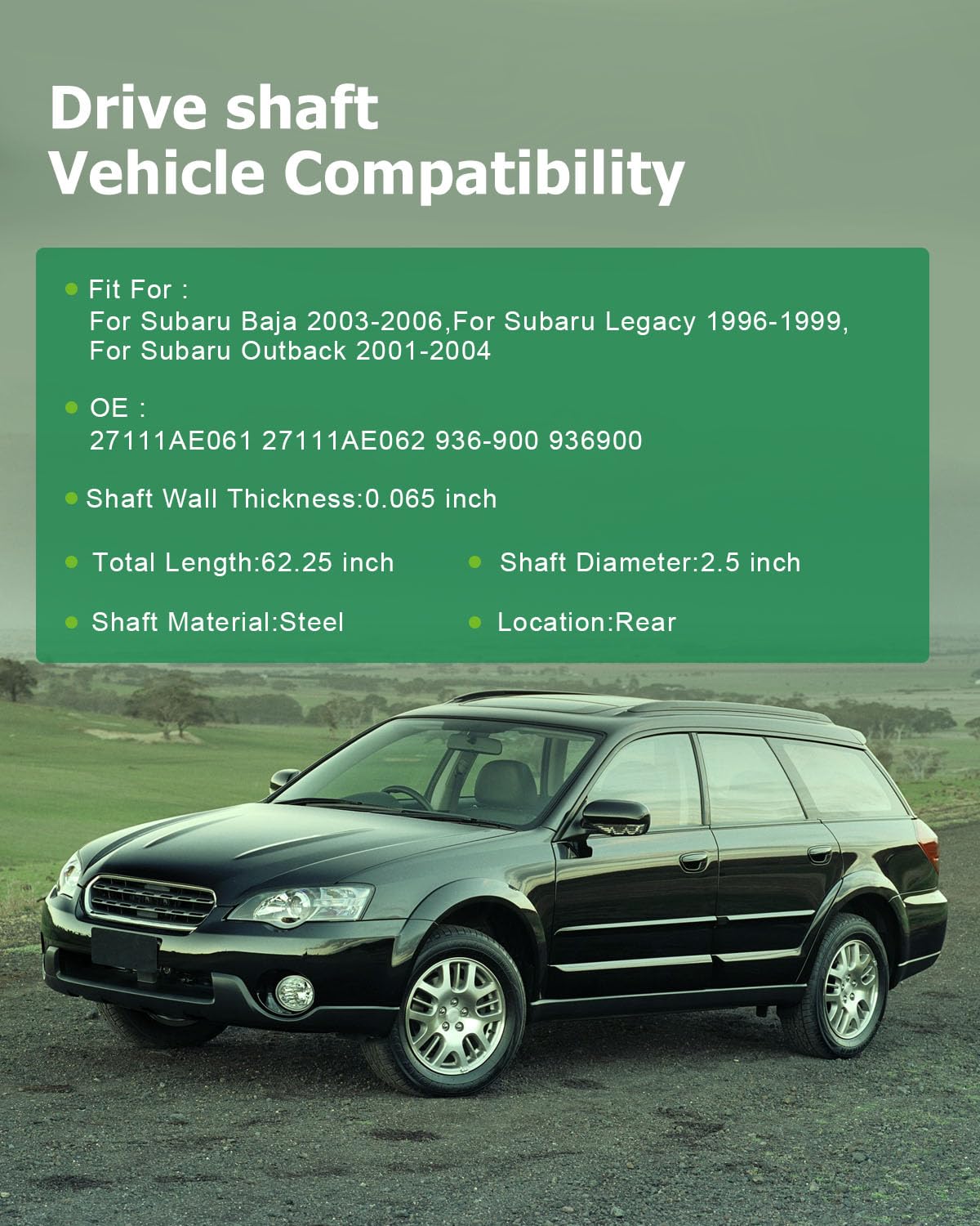 Q: What vehicles are compatible with the SCITOO Rear Drive Shaft Assembly?A: The SCITOO Rear Drive Shaft Assembly is compatible with Subaru Baja models from 2003 to 2006, Subaru Legacy models from 1996 to 1999, and Subaru Outback models from 2001 to 2004. Always check your vehicle's year, make, and model before ordering.