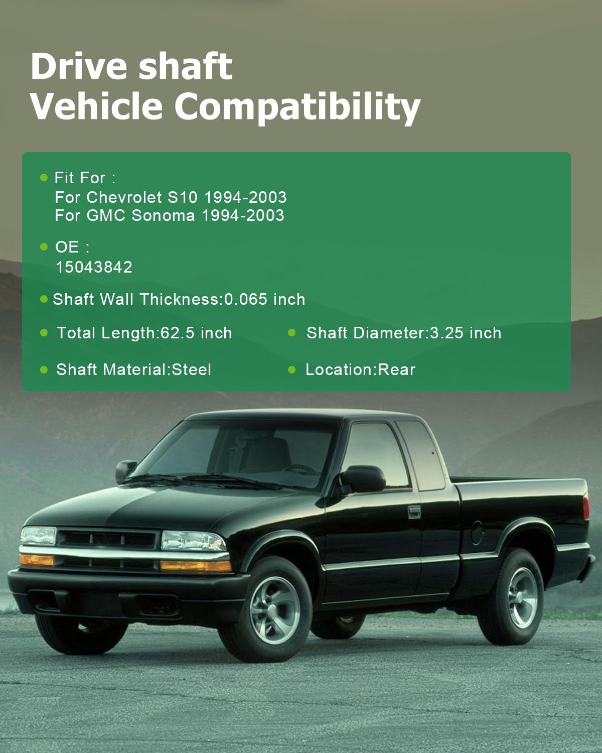 Q: What vehicles are compatible with the SCITOO 62.5" Rear Drive Shaft Assembly?A: The SCITOO 62.5" Rear Drive Shaft Assembly is compatible with Chevy S10 models from 1994 to 2003 and GMC Sonoma models from 1994 to 2003. Ensure to verify your vehicle’s year, make, and model using the part finder tool before ordering.