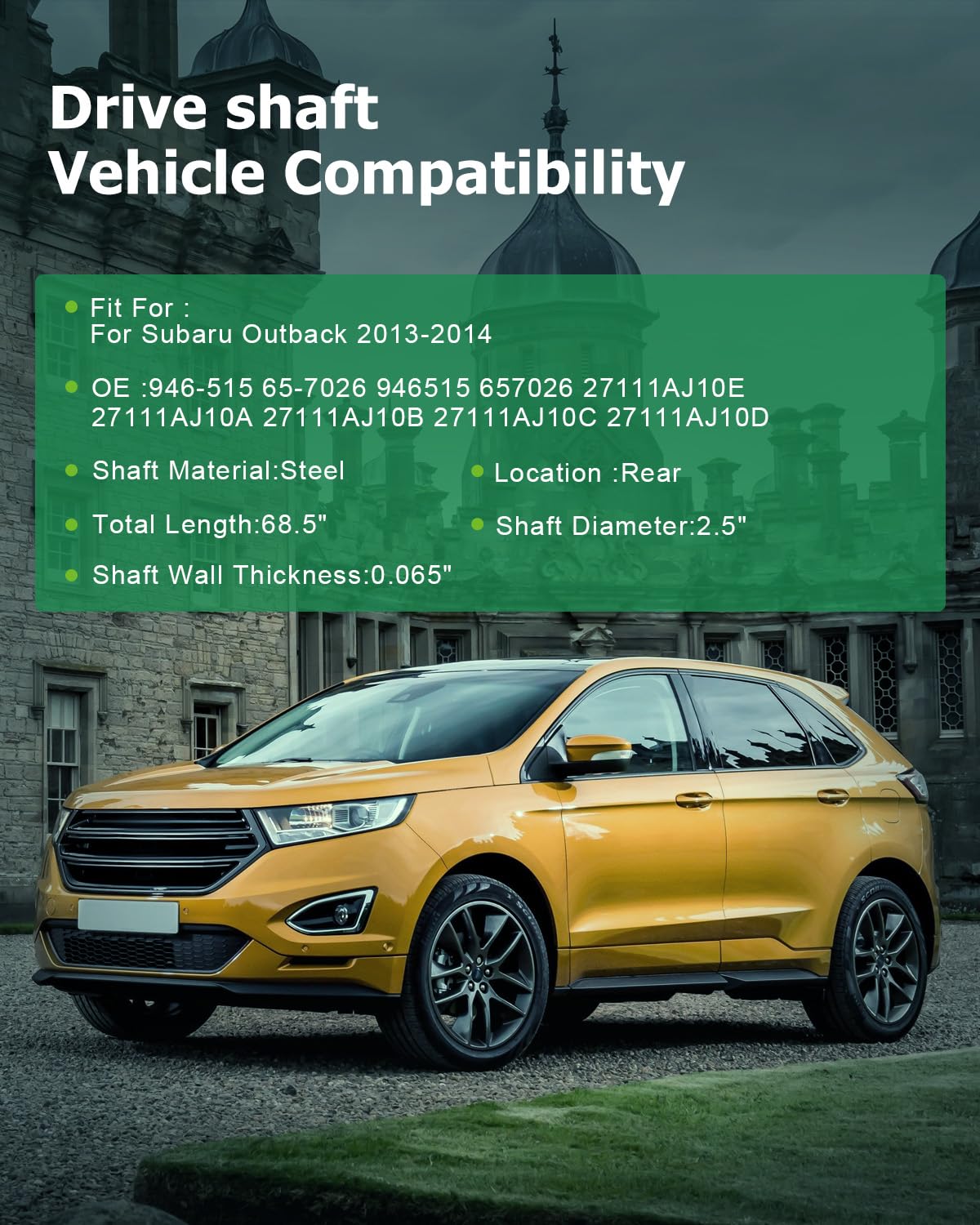 Q: What vehicles are compatible with the SCITOO Steel Rear Driveshaft Assembly?A: The SCITOO Steel Rear Driveshaft Assembly is specifically compatible with Subaru Outback models from 2013 and 2014 with a 2.5L engine. It is designed to fit seamlessly with OE numbers 946-515, 65-7026, 946515, 657026, 27111AJ10E, 27111AJ10A, 27111AJ10B, 27111AJ10C, and 27111AJ10D.