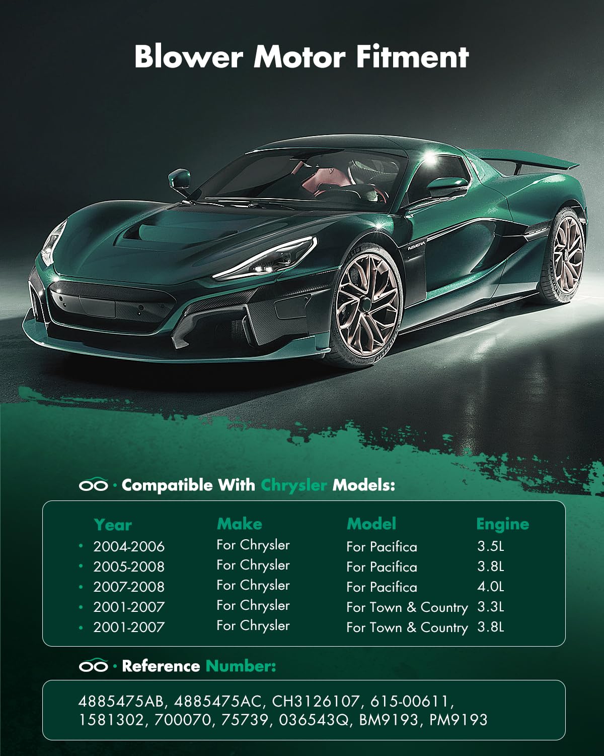 FIT THE FOLLOWING VEHICLES:2004-2006 For Chrysler For Pacifica V6 3.5L2005-2008 For Chrysler For Pacifica V6 3.8L2007-2008 For Chrysler For Pacifica V6 4.0L2001-2007 For Chrysler For Town & Country V6 3.3L2001-2007 For Chrysler For Town & Country V6 3.8L2001-2007 For Dodge For Caravan l4 2.4L2001-2007 For Dodge For Caravan V6 3.3L2001-2007 For Dodge For Grand Caravan V6 3.3L2001-2007 For Dodge For Grand Caravan V6 3.8L