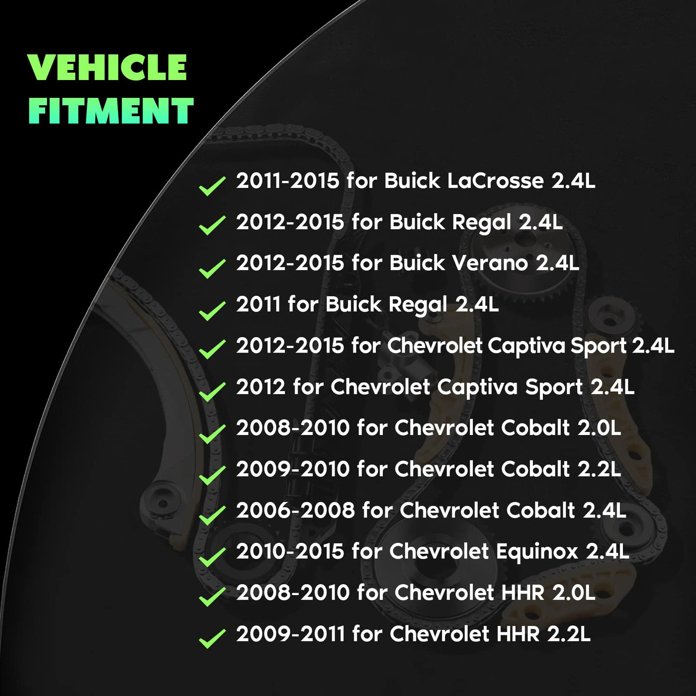 Q: What vehicles are compatible with the SCITOO 94201S Timing Chain Kit?A: The SCITOO 94201S Timing Chain Kit is compatible with various models including 2011-2015 Buick LaCrosse, Buick Regal, and Buick Verano, as well as 2012-2015 Chevy Captiva Sport, 2006-2010 Chevy Cobalt, and many others.