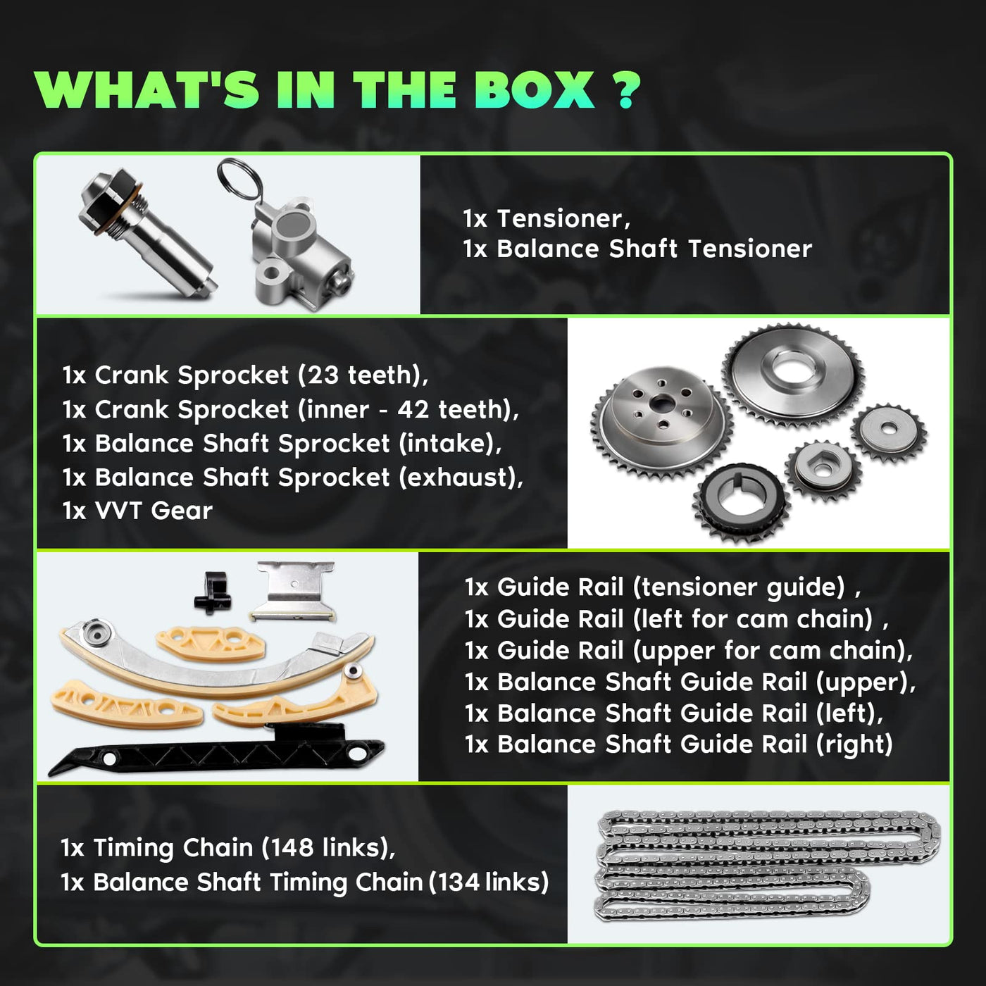 Q: What does the SCITOO Timing Chain Kit include?A: This timing chain kit includes essential components such as a timing chain (148 links), crank sprocket (23 teeth), VVT gear, guide rails, tensioners, and balance shaft timing chain, ensuring you have everything you need for a complete installation.