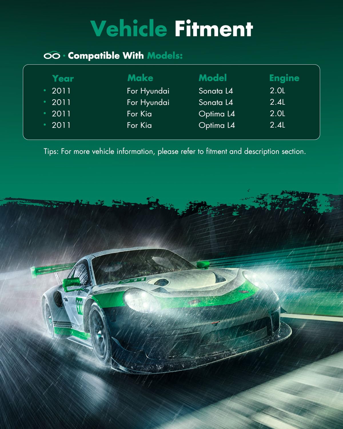 AC Compressor: 2011 Fit for Hyundai Sonata 2.0L2011 Fit for Hyundai Sonata 2.4L2011 Fit for Kia Optima 2.0L2011 Fit for Kia Optima 2.4L Please clean The cooling system pipe of the your car ,Before installing the compressor.The oil content of itself can already meet the normal operation of the ac compressor. If the oil is added to the load, it will cause the compressor to vibrate or be damaged