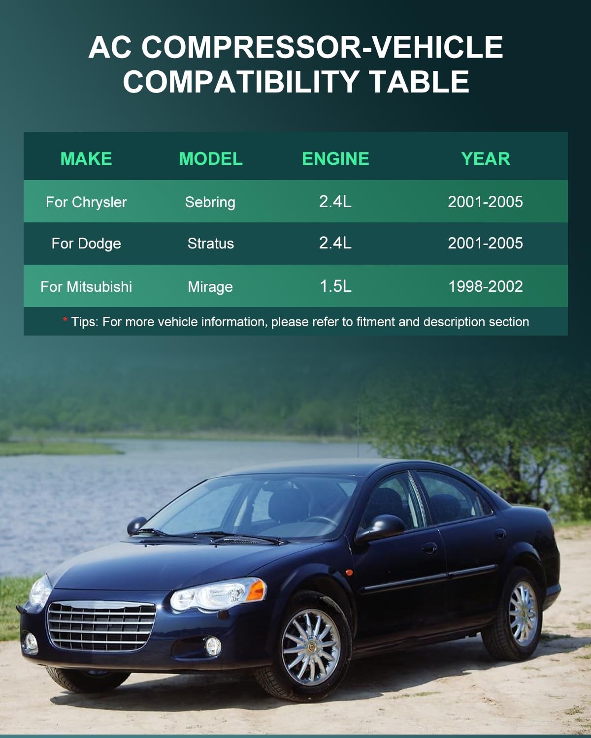 Applications:*2001-2005 Compatible for D-odge Stratus 2.4L*2000-2005 Compatible for M-itsubishi Eclipse 2.4L*2000-2003 Compatible for M-itsubishi Galant 2.4L*2002-2007 Compatible for M-itsubishi Lancer 2.0L*1998-2002 Compatible for M-itsubishi Mirage 1.5L*1998-2002 Compatible for M-itsubishi Mirage 1.8LPACKAGE INCLUDES:1 A/C COMPRESSOR W/ CLUTCH Please clean The cooling system pipe of the your car ,Before installing the compressor.The oil content of itself can already meet the normal operation of the ac compressor. If the oil is added to the load, it will cause the compressor to vibrate or be damaged