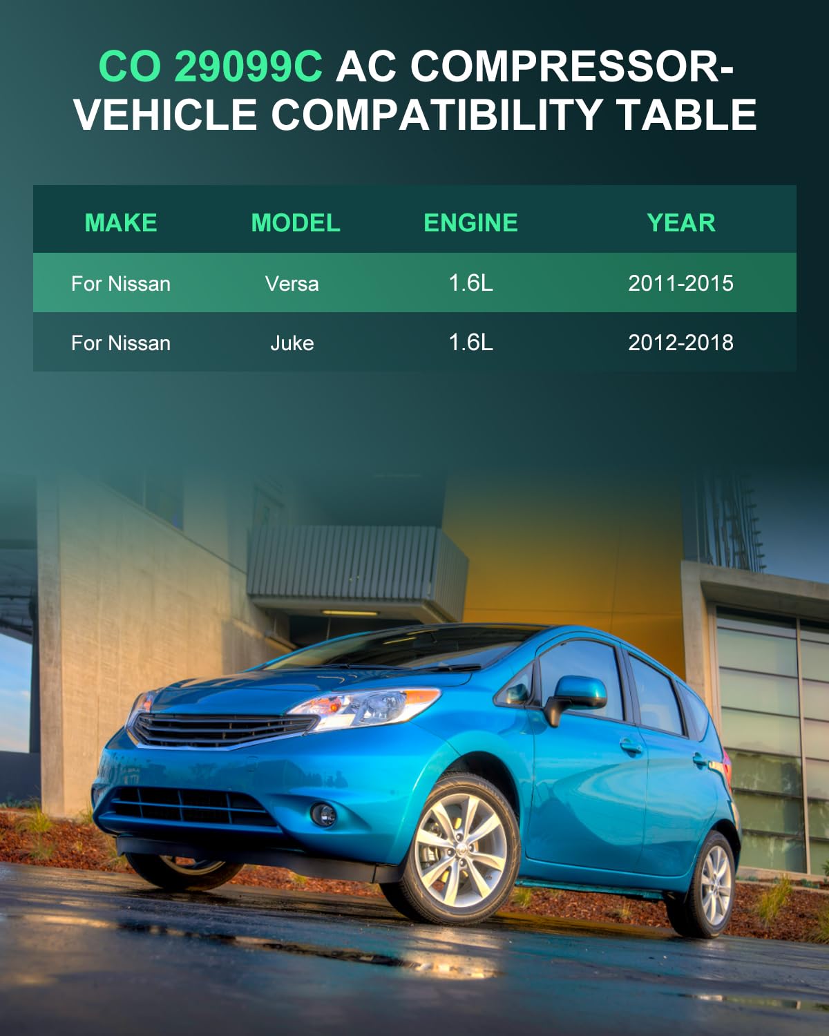 Q: What vehicles are compatible with the SCITOO AC Compressor?A: The SCITOO AC Compressor is compatible with Nissan Juke models from 2011 to 2015, Nissan Versa models from 2012 to 2018, and Nissan Versa Note models from 2014 to 2018, all with a 1.6L engine.