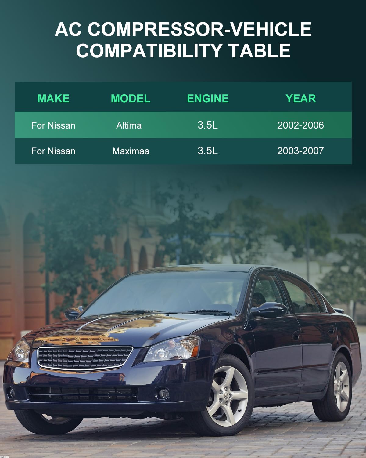 Application:2002-2006 for N-issan Altima 3.5L2003-2007 for N-issan Maxima 3.5LPackage Including:AC Compressor Please clean The cooling system pipe of the your car ,Before installing the compressor.The oil content of itself can already meet the normal operation of the ac compressor. If the oil is added to the load, it will cause the compressor to vibrate or be damaged