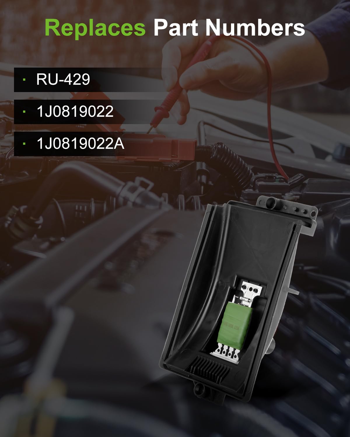 The item is the Blower Motor Resistor. It is just what you need to bring your heating and A/C blower system back to good working order.On most vehicles it is mounted to the HVAC unit inside the passenger compartment. It can be accessed from the passenger foot well area.Specification: Replaces dealer part numbers: 1J0819022A/RU-429/1J0 819 022A/1J0-819-022A/4P1646/JA1768GUARANTEED - Brand New and tested prior when the Heater Blower Motor was leaving the factory.EASY INSTALII - Direct Replacement for Heater Blower Motor RegulatorNew product - The Blower Motor is not remanufactured or rebuilt.QUALITY - High Quality OEM Replacement Blower Motor.SUITABLE - HVAC Motor Resistor Kit Fits and Quality Guaranteed.Note: If you met those issues,then the blower motor resistor may be your solution.HVAC Stop workingFan only works in one direction;Can't adjust the Air Volume;Get Warning in dashboard.Package Including1 x Blower Motor Resistor