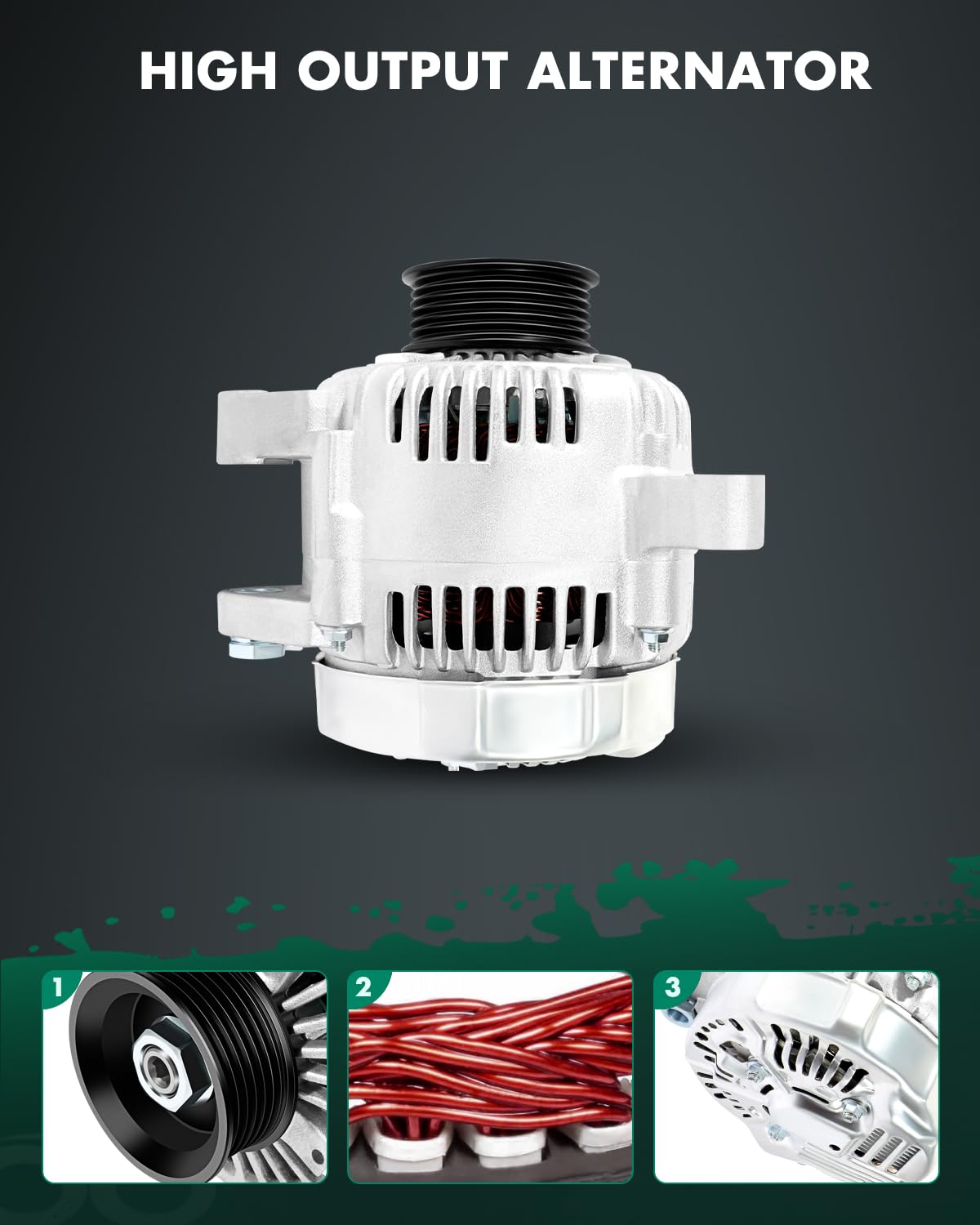 ??Compatibility - New alternator replacement for 1999-2003 For Lexus RX300 for 2001-2003 For Toyota Highlander | ??Alternator Specifications - 100 Amp/12 Volt, CW, 6-Groove Pulley, IR/IF, 100% New, high output alternator is compact and lightweight, fully compatible with the equipment system of your vehicle. | ??Alternator OEM - Direct OEM replacement for your malfunctioning part, OE number - 13844 , AND0184, 101211-7840, 102211-0590, 102211-0840, 9662219-084, 400-52136, ALT-6098, 27060-20110, 27060-20140, 27060-20200, 1-2277-01ND, 1-2277-02ND | ??Premium Alternators - Automotive replacement alternators throught precision CNC machined castings, increased output and additional provisions for cooling: Internal Fan; that reduce stress on the alternator and increase its life expectancy for a more reliable driving experience? | ??Reliable Alternator Replacement - Bearing 100% tested to OE standards and repacked with OEM grade lubricant. All dimensions, key mounting surfaces, and contact points are gauged and measured for proper fit. Throught igorous and accelerated cycling tests to ensure the quality and durability of product.