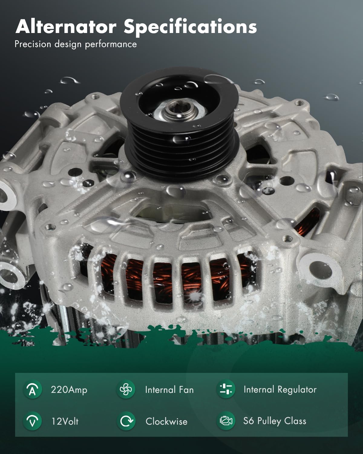 ?Alternator Fitment?- Automotive new alternator replacement for Dodge for Sprinter 2500/for Sprinter 3500 2007-2008 V6 3.5L; for Freightliner for Sprinter 2500/for Sprinter 3500 2007-2008 V6 3.5L; for Mercedes-Benz C216 CL550 2007-2008 V8 5.5L, W221 S550 2008-2011 V8 5.5L | ?Alternators Specifications?- Voltage: 12V; Amperage: 220A; Rotation: CW(Clockwise); Regulator: IR ; Fan: IF; Grooves: S6 Pulley Class; Condition: New, high output alternator is compact and lightweight, fully compatible with the electronic system of your vehicle | ?Car Alternator Reference Number?- Direct OEM replacement for your malfunctioning part, OE number : 11305 400-24225, VBO0407 0-121-813-001, 0-121-813-101 68011843AA, 68011843AC, 68011843AD 013-154-05-02 12201201-A | ?Easy Installation?- (1) Be sure to disconnect the negative electrode of the battery; (2) When replacing, pay attention to the appropriate tension of the transmission belt: if too loose, it may slip and cause insufficient power generation; If too tight, it can easily damage the belt and alternator bearings; (3) When replacing, pay attention to tightening all screws. If you have any problems during use, then get in touch with us, we will supply you with professional technical support | ?Note?SCITOO Auto supply alternator for most cars, SUVs, trucks and trailers. Please select your vehicle (year/make/model/trim) in the top left corner of the page to confirm compatibility or refer to the vehicle information in the description