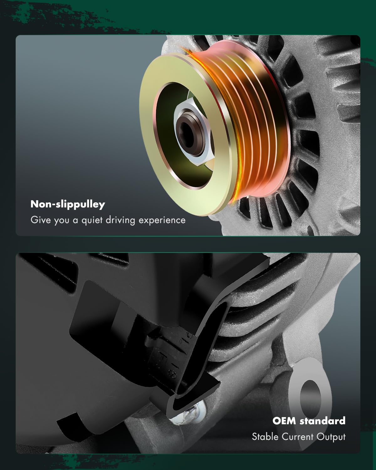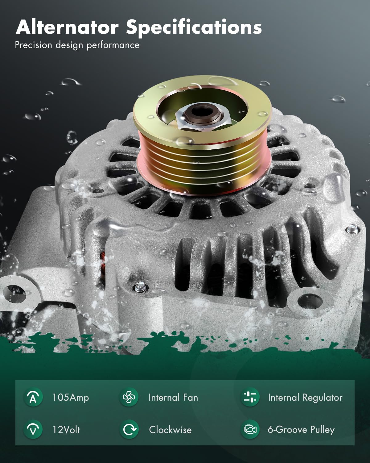 ?Alternator Fitment?- Automotive new alternator replacement for Buick for Century 2002,for Buick for Century 2003,for Buick for Century 2004,for Buick for Regal 2002,for Buick for Regal 2003,for Buick for Regal 2004,for Chevrolet for Impala 2002,for Chevrolet for Impala 2003,for Chevrolet for Impala 2004,for Chevrolet for Monte Carlo 2002,for Chevrolet for Monte Carlo 2003,for Chevrolet for Monte Carlo 2004 | ?High-Performance Specifications? - Engineered with Voltage: 12V; Amperage: 105Amp; Rotation: CW (Clockwise); Regulator: IR (Internal Regulator) ; Fan: IF (Internal Fan); Grooves: 6-Groove Pulley; Condition: New, high output alternator is compact and lightweight, fully compatible with the electronic system of your vehicle, this automotive replacement alternator delivers reliable power for your car, it
