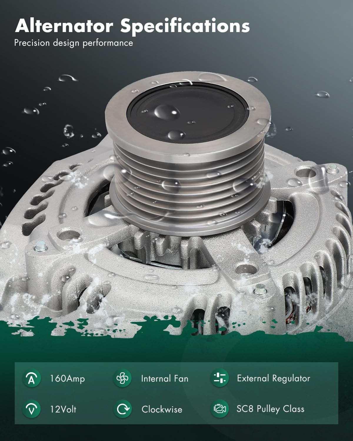?Alternator Fitment?- Automotive new alternator replacement for Dodge for Ram 2500 2008,for Dodge for Ram 2500 2009,for Dodge for Ram 2500 2010,for Dodge for Ram 3500 2007,for Dodge for Ram 3500 2008,for Dodge for Ram 3500 2009,for Dodge for Ram 3500 2010,for Dodge for Ram 4500 2008,for Dodge for Ram 4500 2009,for Dodge for Ram 4500 2010,for Dodge for Ram 5500 2008,for Dodge for Ram 5500 2009,for Dodge for Ram 5500 2010,for Ram for 2500 2011,for Ram for 2500 2012,for Ram for 3500 2011 | ?High-Performance Specifications? - Engineered with Voltage: 12V; Amperage: 160Amp; Rotation: CW (Clockwise); Regulator: ER (External Regulator) ; Fan: IF (Internal Fan); Grooves: SC8 Pulley Class; Condition: New, high output alternator is compact and lightweight, fully compatible with the electronic system of your vehicle, this automotive replacement alternator delivers reliable power for your car, it