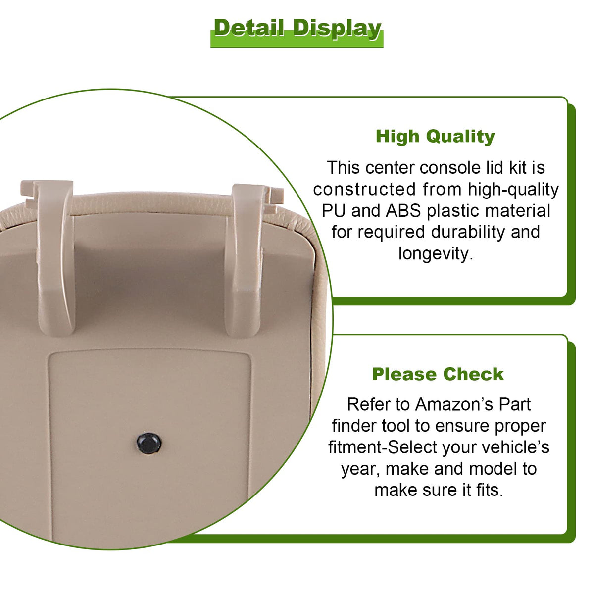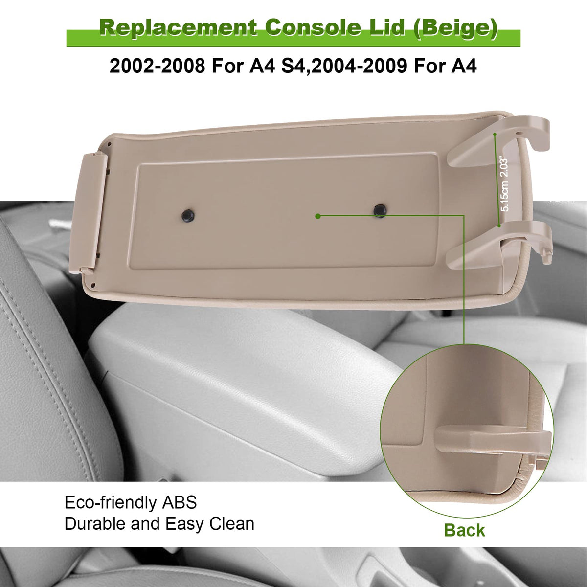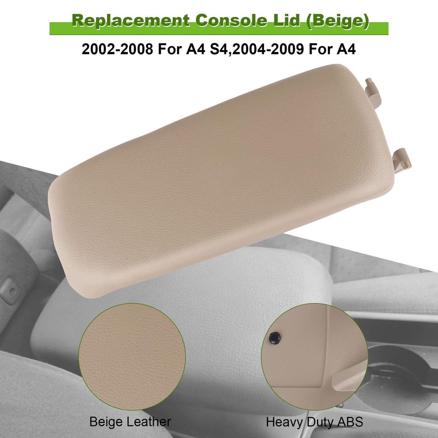 Fitment:2000-2008 for Audi A4 A6 S4Feature:Center Console Lid Armrest CoverOnly Leather Skin Is IncludedMade of Leather SyntheticArmrest Cover With Double French StitchingColor: BeigeStitching Color:BeigeWhat’s in the package:Console Lid Armrest Assembly(include console and leather cover)