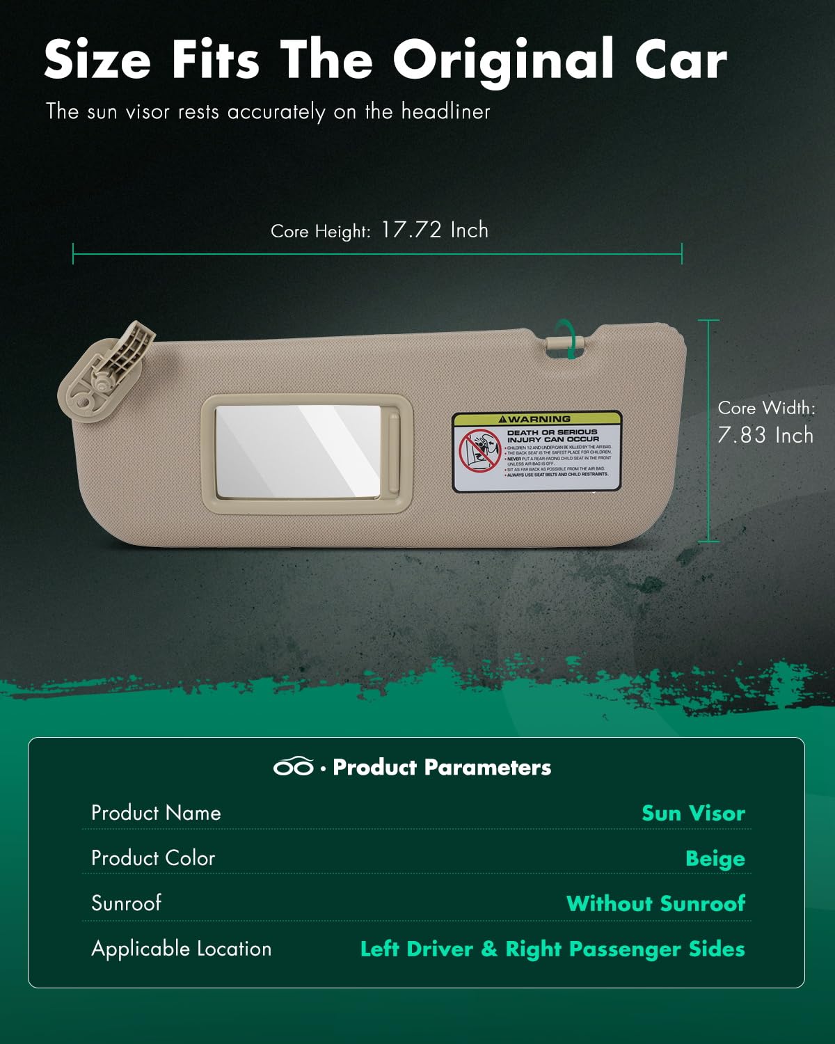 Fitment:Left Driver & Right Passenger Sides Sunvisor Replacement For 2011 2012 2013 2014 2015 For Hyundai For Elantra | Replace For:Part Number 852103X000TX Left Driver & Right Passenger Sides.Please check the number to fit your car before purchasing,and make sure the year,model,applicable information | Easy Installation:Precise mounting holes and snaps for a secure fit, no drilling or more screws without any damaging, you can replace your old sun visor directly, and you just need to snap the sun visor bracket into place with the car's bracket cover part to put it in the right place | Features:According to the original factory specifications.Built to strict quality control standards. Stable characteristics, high reliability. Aftermarket Products with Premium Quality | Buy with Confidence:Non-Infringement Disclaimer for Auto Parts Sales. Please note that all references to brand names and models are for compatibility purposes only and do not imply any affiliation or endorsement by the original manufacturer
