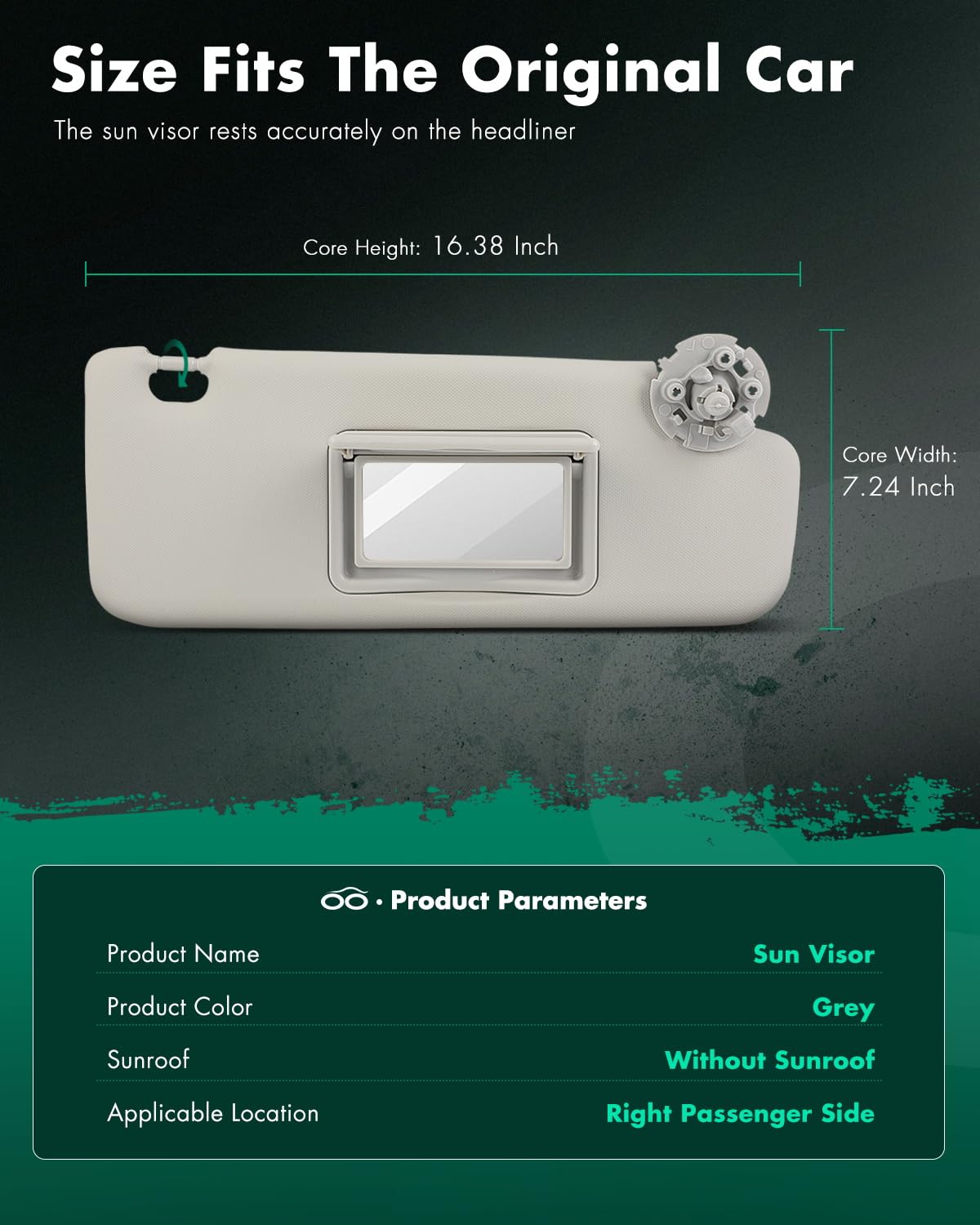 Fitment:Right Passenger Side Sunvisor Replacement For 2012 2013 2014 2015 2016 For Chevrolet Sonic | Replace For:Part Number P95327507 Right Passenger Side.Please check the number to fit your car before purchasing,and make sure the year,model,applicable information | Easy Installation:Precise mounting holes and snaps for a secure fit, no drilling or more screws without any damaging, you can replace your old sun visor directly, and you just need to snap the sun visor bracket into place with the car's bracket cover part to put it in the right place | Features:According to the original factory specifications.Built to strict quality control standards. Stable characteristics, high reliability. Aftermarket Products with Premium Quality | Buy with Confidence:Non-Infringement Disclaimer for Auto Parts Sales. Please note that all references to brand names and models are for compatibility purposes only and do not imply any affiliation or endorsement by the original manufacturer