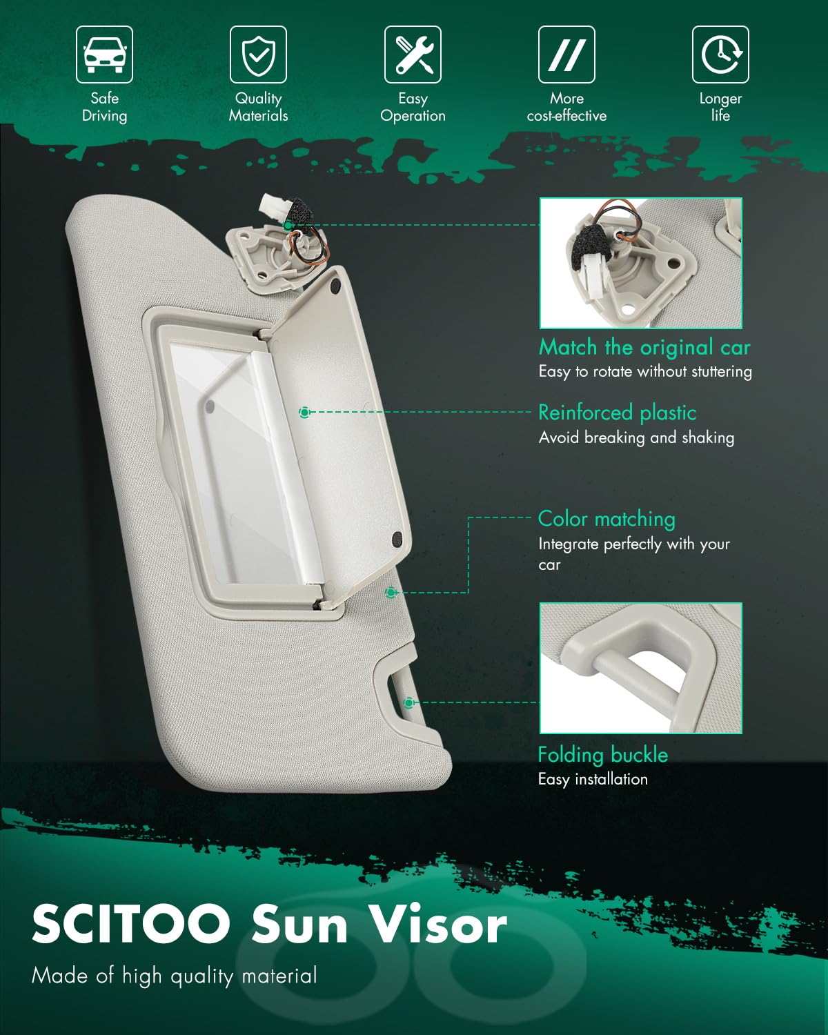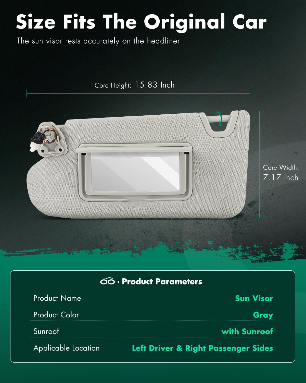 Fitment:Left Driver & Right Passenger Sides Sunvisor Replacement For 2013 2014 2015 2016 2017 2018 For Nissan For Altima | Replace For:Part Number 96401-3TA2A,96400-3TA2A Left Driver & Right Passenger Sides.Please check the number to fit your car before purchasing,and make sure the year,model,applicable information | Easy Installation:Precise mounting holes and snaps for a secure fit, no drilling or more screws without any damaging, you can replace your old sun visor directly, and you just need to snap the sun visor bracket into place with the car's bracket cover part to put it in the right place | Features:According to the original factory specifications.Built to strict quality control standards. Stable characteristics, high reliability. Aftermarket Products with Premium Quality | Buy with Confidence:Non-Infringement Disclaimer for Auto Parts Sales. Please note that all references to brand names and models are for compatibility purposes only and do not imply any affiliation or endorsement by the original manufacturer