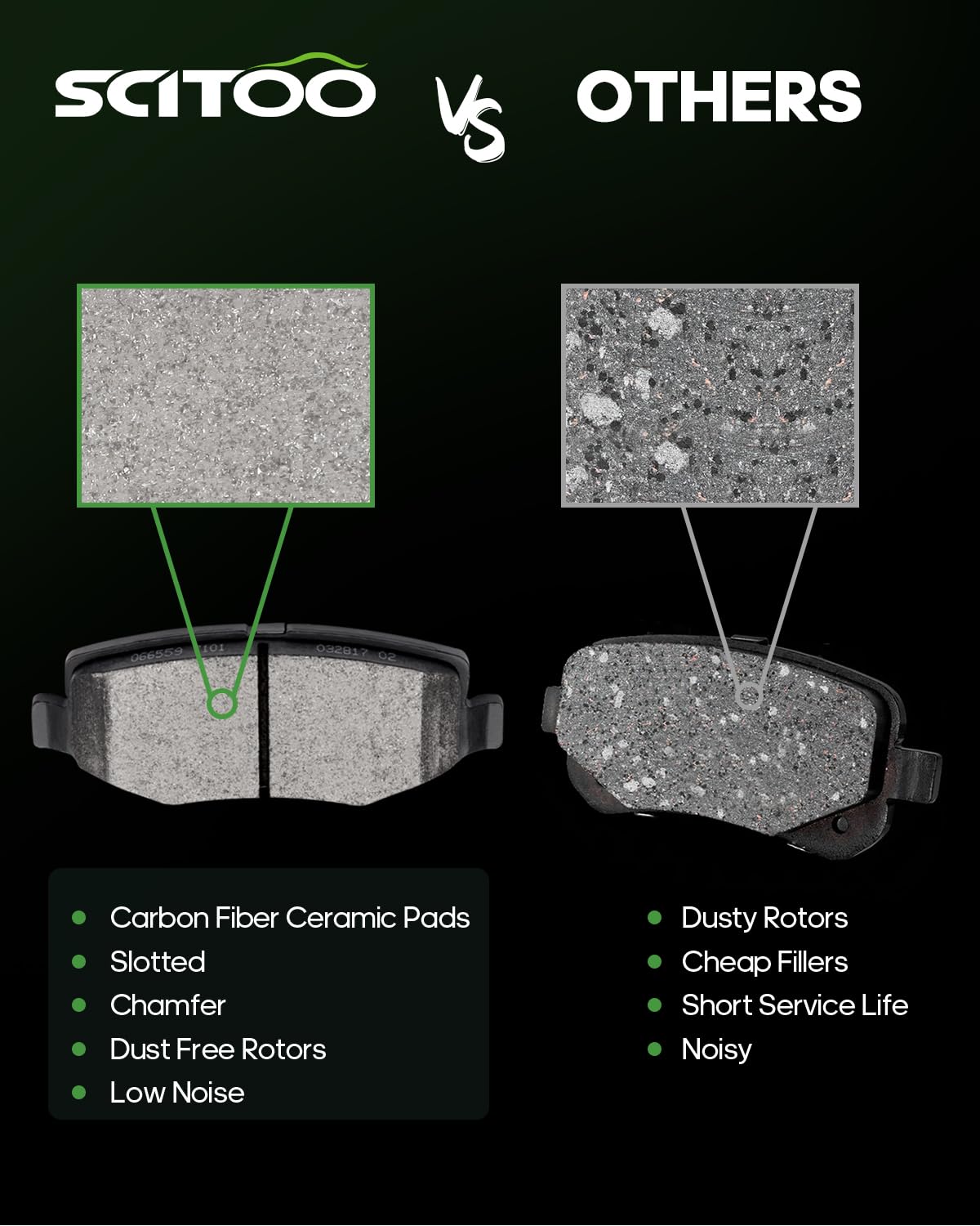 Q: Are SCITOO Ceramic Brake Pads noisy during operation?A: No, the SCITOO Ceramic Brake Pads are designed to minimize noise. Their unique slotting design improves drainage and heat distribution, which enhances stopping power while ensuring a quiet driving experience.