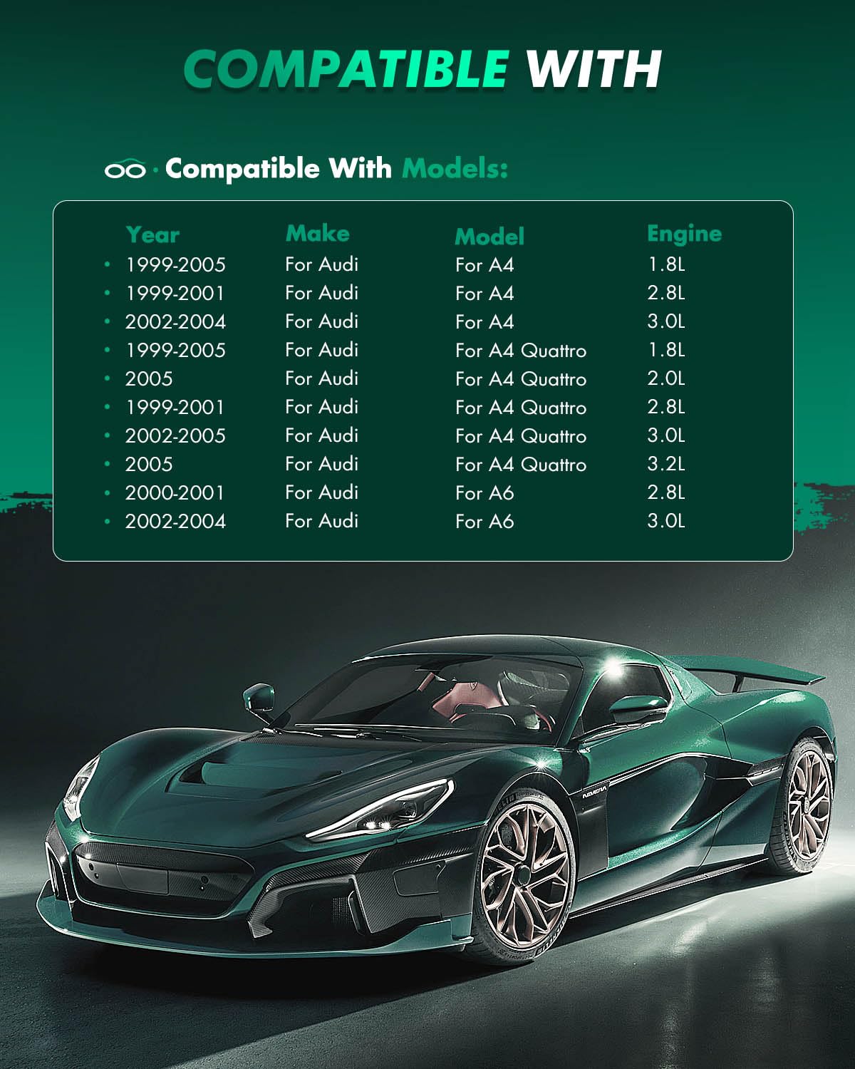 Fitment:For Audi A4 1.8L 1999-2005For Audi A4 2.8L 1999-2001For Audi A4 3.0L 2002-2004For Audi A4 Quattro 1.8L 1999-2005For Audi A4 Quattro 2.0L 2005For Audi A4 Quattro 2.8L 1999-2001For Audi A4 Quattro 3.0L 2002-2005For Audi A4 Quattro 3.2L 2005For Audi A6 2.8L 2000-2001For Audi A6 3.0L 2002-2004For Audi A6 Quattro 2.7L 2000-2004For Audi A6 Quattro 2.8L 2000-2001For Audi A6 Quattro 3.0L 2002-2004For Audi A6 Quattro 4.2L 2000-2004For Volkswagen For Passat 1.8L 1998-2005For Volkswagen For Passat 1.9L 1993-1997For Volkswagen For Passat 2.0L 1990-1993 1995-1996 2004-2005For Volkswagen For Passat 2.8L 1998-2005For Volkswagen For Passat 4.0L 2002-2004