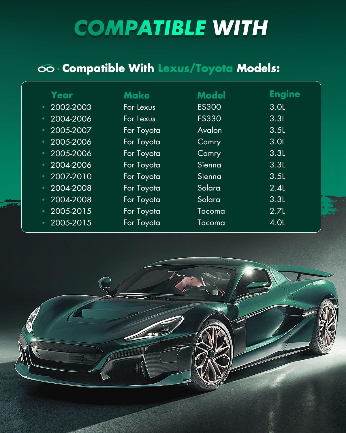 COMPATIBLE VEHICLES : 4PCS Brake Pads For Lexus ES300 3.0L 2002-2003,For Lexus ES330 3.3L 2004-2006,For Toyota Avalon 3.5L 2005-2007,For Toyota For Camry 3.0L 2005-2006,For Toyota For Camry 3.3L 2005-2006,For Toyota For Sienna 3.3L 2004-2006,For Toyota For Sienna 3.5L 2007-2010,For Toyota Solara 2.4L 2004-2008,For Toyota Solara 3.3L 2004-2008,For Toyota For Tacoma 2.7L 2005-2015,For Toyota For Tacoma 4.0L 2005-2015 | Used For : The gasket serves as a buffer between the caliper piston and the brake pad back plate. They act to absorb vibrations,which will reduce noise | Brake Pads Feature : The pads with slotting design increases friction, heated evenly, heat faster,better ventilation, improves drainage.Ensure exceptional stopping power and quiet operation | Easy Installation : Manufactured to precise OE requirements to meet your car's needs.Designed to be integrated, easy to install and save time | BUYER NOTICE : Please check picture,part number and Fitment information to verify if this is the correct one you need before purchasing