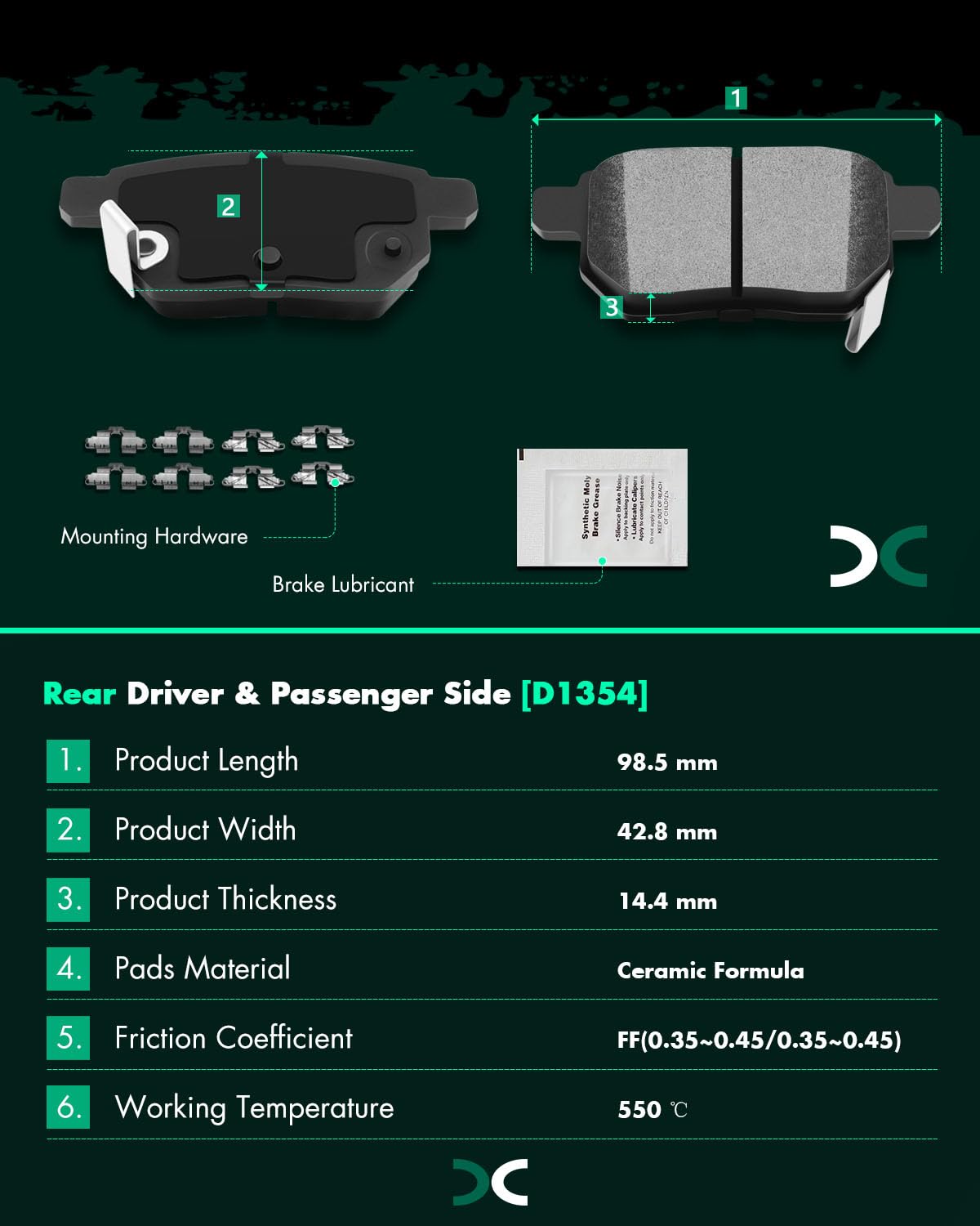 Compatible Vehicles - For Pontiac For Vibe 2009 2010,For Scion For iM 2016,For Scion For tC 2011 2012 2013 2014 2015 2016,For Scion For xB 2008 2009 2010 2011 2012 2013 2014 2015,For Toyota For Corolla 2009 2010 2011 2014 2015 2016 2017 2018 2019,For Toyota For Corolla iM 2017 2018,For Toyota For Matrix 2009 2010 2011 2012 2013 2014,For Toyota For Yaris 2012 2013 2014 2015 2016 2017 | Specification ---- D1354-8463 Rear Pads -- Thickness of Friction Material: 14.4 mm;Friction coefficient: FF(0.35~0.45/0.35~0.45);Tolerant Temperature: 550?;Brake Pads Thickness: 38.1mm;Product length: 98.5mm;Product width: 42.8mm | Feature - 4 x Brake Pads Design to further reduce brake noise and increase 20% more braking power | Ultra Durable Quality - Our Brake Pads Kits accessories are made of extremely durable materials and work well without sacrificing functionality | Buyer Notice - Please check picture,part number and fitment information to verify if this is the correct one you need before purchasing.Please get in touch with us at any time if the product has any issues.We offer a wide variety of Brake Pads/Brake Rotors/Brakes Kits, so there's one to match your car