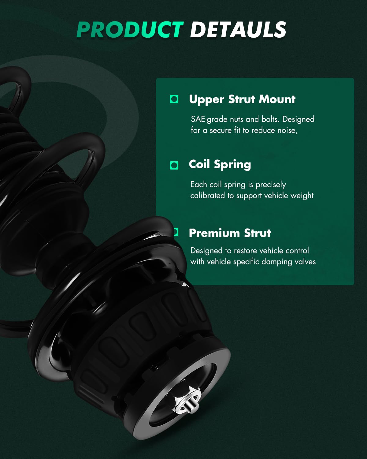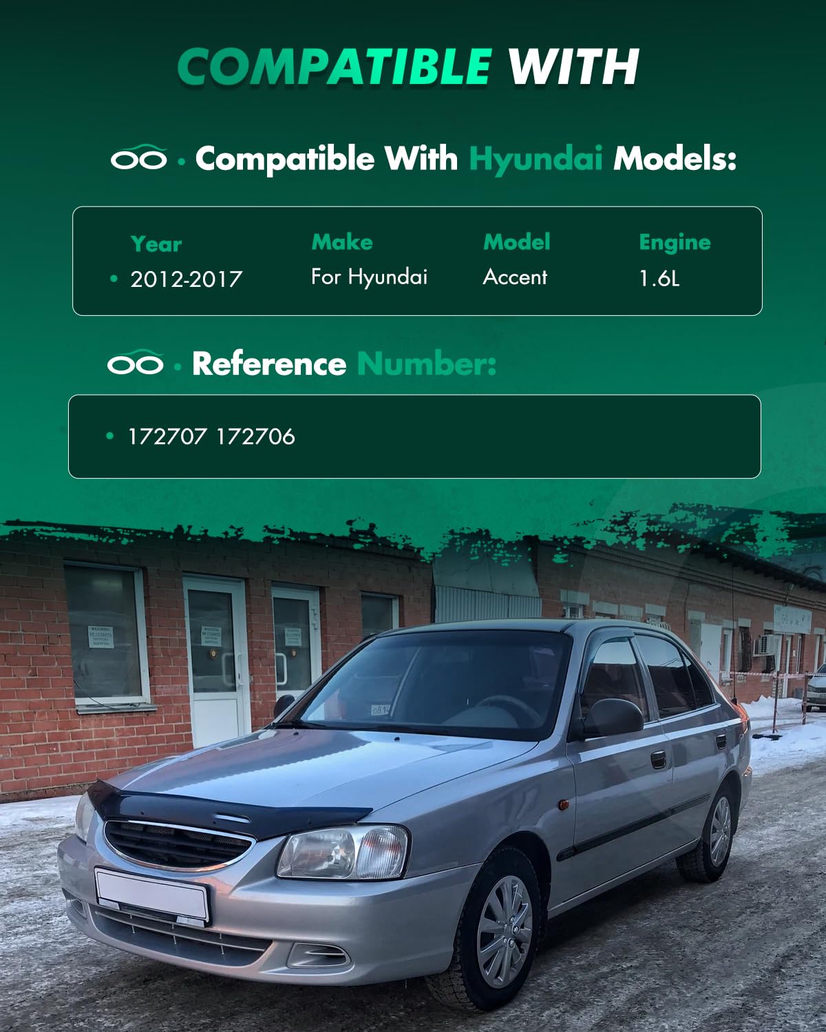 COMPATIBLE (please check:Year/Make/Model/Trim/Engine):2012-2017 for Hyundai Accent GL Hatchback 4-Door2012-2017 for Hyundai Accent GL Sedan 4-Door2012-2013 2016-2017 for Hyundai Accent GLS Hatchback 4-Door2012-2017 for Hyundai Accent GLS Sedan 4-Door2012-2015 for Hyundai Accent GS Hatchback 4-Door2012-2017 for Hyundai Accent L Hatchback 4-Door2012-2017 for Hyundai Accent L Sedan 4-Door2016-2017 for Hyundai Accent LE Hatchback 4-Door2016-2017 for Hyundai Accent LE Sedan 4-Door2012-2017 for Hyundai Accent SE Hatchback 4-Door2015-2017 for Hyundai Accent SE Sedan 4-Door2015-2017 for Hyundai Accent Sport Hatchback 4-Door2017 for Hyundai Accent Value Edition Sedan 4-DoorPART NUMBERS:172707 | 172706 ITEM-OFFERED:--1x front left strut shock assembly with coil spring--1x front left strut shock assembly with coil spring PREMIUM-PERFORMANCE:Manufactured with first-class steels, featuring a superior tube and weld design to deliver structural integrity and durability