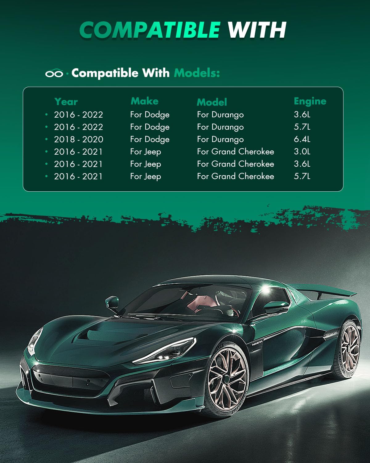 Specifications: Placement on Vehicle: Front Left & RightPad Compound: Metal FormulaOEM PART NUMBER(S): 4 x Front Brake Pads - D1904-8856Package Contains: 4PCS x Brake PadsFit For: For Dodge For Durango 3.6L 2016-2022For Dodge For Durango 5.7L 2016-2022For Dodge For Durango 6.4L 2018-2020For Jeep For Grand Cherokee 3.0L 2016-2021For Jeep For Grand Cherokee 3.6L 2016-2021For Jeep For Grand Cherokee 5.7L 2016-2021