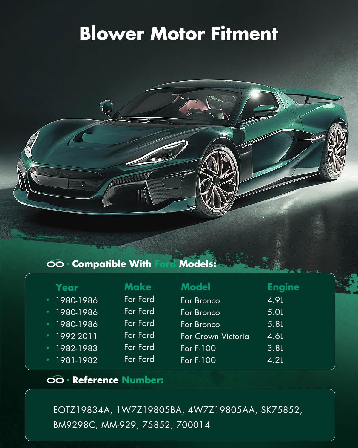 Fit The Following Vehicles:For Ford For Bronco 4.9L 1980-1986For Ford For Bronco 5.0L 1980-1986For Ford For Bronco 5.8L 1980-1986For Ford For Crown Victoria 4.6L 1992-2011For Ford For F-100 3.8L 1982-1983For Ford For F-100 4.2L 1981-1982For Ford For F-100 4.9L 1980-1983For Ford For F-100 5.0L 1980-1983For Ford For F-150 3.8L 1986For Ford For F-150 4.9L 1980-1986For Ford For F-150 5.0L 1980-1986For Ford For F-150 5.8L 1980-1986For Ford For F-150 6.9L 1984For Ford For F-250 4.9L 1980-1986For Ford For F-250 5.0L 1980-1986For Ford For F-250 5.8L 1980-1986For Ford For F-250 6.6L 1980-1982For Ford For F-250 6.9L 1983-1986For Ford For F-250 7.5L 1983-1986For Ford For F-350 4.9L 1980-1986For Ford For F-350 5.0L 1980-1986For Ford For F-350 5.8L 1980-1986For Ford For F-350 6.6L 1980-1982For Ford For F-350 6.9L 1983-1986For Ford For F-350 7.5L 1983-1986For Ford For Ltd 4.2L 1981-1982For Ford For Ltd 5.0L 1979-1982For Ford For Ltd 5.8L 1979-1982For Ford For Ltd Crown Victoria 5.0L 1987-1991For Ford For Ltd Crown Victoria 5.8L 1987-1991For Lincoln For Mark Vi 5.0L 1980-1983For Lincoln For Mark Vi 5.8L 1980For Lincoln For Town Car 4.6L 1991-1997For Lincoln For Town Car 5.0L 1981-1990For Mercury For Grand Marquis 4.6L 1998-2011For Mercury For Marauder 4.6L 2003-2004