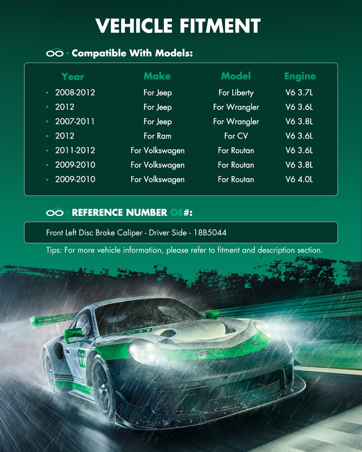 Specification:Placement on Vehicle: Front Left (Driver Side)Brake Calipers:Bracket: withInlet Port Size: M10 x 1.0Bleeder Port Size: M10 x 1.0Piston Size: 66mmBrake Piston Count: 1 PistonPiston Material: PhenolicCaliper Finish: ZincificationInterchange Part Number: 18B5044Package Includes: 1 x Brake CaliperCompatible with:(For More Details, Please Check ''FITMENT'' in the Upper Left Corner)For Chrysler Town & Country 2008-2012For Dodge Grand Caravan 2008-2016For Dodge Nitro 2007-2010For Jeep Liberty 2008-2012For Jeep Wrangler 2007-2012For Ram C/V 2012For VolkswagenFor Routan 2009-2012