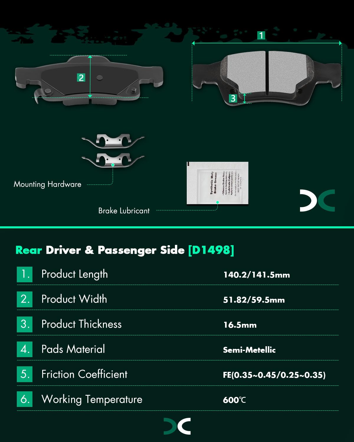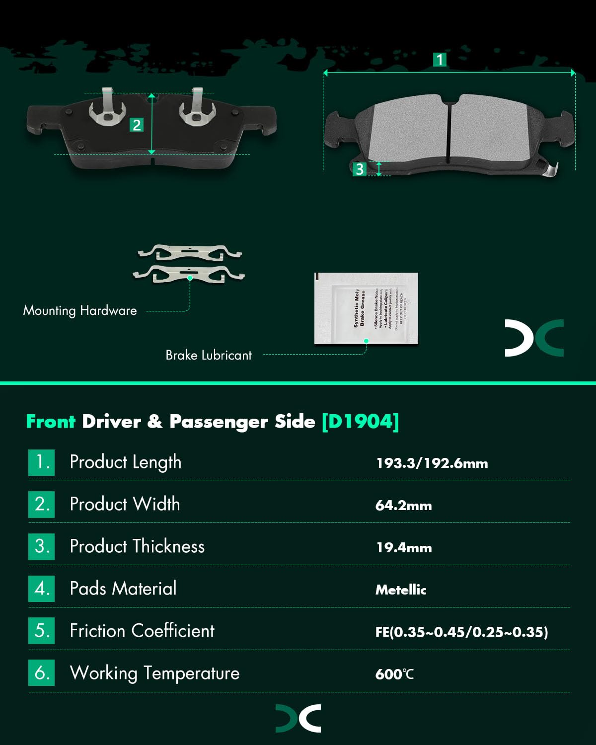 Specifications: Placement on Vehicle: Front Left & RightPad Compound: Front - Metal Formula & Rear - Semi-metal FormulaOEM PART NUMBER(S): 4 X Front Brake Pads - D1904-88564 X Rear Brake Pads - D1498-8698Package Contains: 8PCS x Brake PadsFit For: For Dodge For Durango 3.6L 2011-2022For Dodge For Durango 5.7L 2011-2022For Dodge For Durango 6.4L 2018-2020For Jeep For Grand Cherokee 3.0L 2014-2021For Jeep For Grand Cherokee 3.6L 2011-2021For Jeep For Grand Cherokee 5.7L 2011-2021For Jeep For Grand Cherokee WK 3.6L 2022