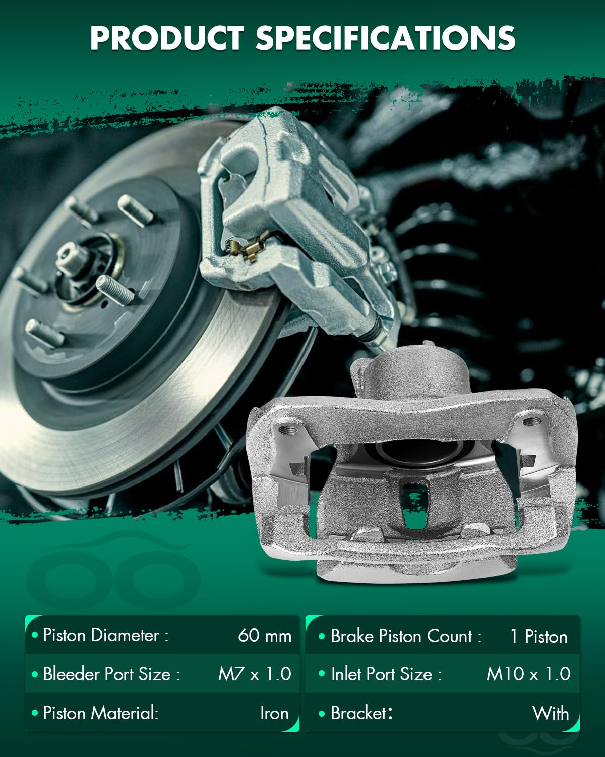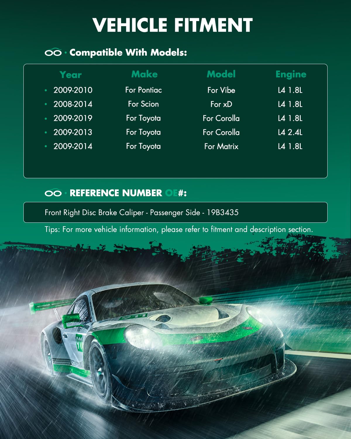 Specification:Placement on Vehicle: Front Right (Passenger Side)Brake Calipers:Bracket: withInlet Port Size: M10 x 1.0Bleeder Port Size: M7 x 1.0Piston Size: 60mmBrake Piston Count: 1 PistonPiston Material: IronCaliper Finish: ZincificationInterchange Part Number: 19B3435Package Includes: 1 x Brake CaliperCompatible with:(For More Details, Please Check ''FITMENT'' in the Upper Left Corner)For Pontiac Vibe Base Wagon 4-Door 1.8L 2009-2010For Scion xD Base Hatchback 4-Door 1.8L 2008-2014For Toyota Corolla 50th Anniversary Special Edition Sedan 4-Door 1.8L 2017For Toyota Corolla Base Sedan 4-Door 1.8L 2009-2011 2014-2019For Toyota Corolla C Sedan 4-Door 1.8L 2014-2017For Toyota Corolla CE Sedan 4-Door 1.8L 2009-2019For Toyota Corolla L Sedan 4-Door 1.8L 2012-2019For Toyota Corolla Le Eco Plus Sedan 4-Door 1.8L 2014For Toyota Corolla LE Eco Sedan 4-Door 1.8L 2014-2019For Toyota Corolla LE Sedan 4-Door 1.8L 2009-2019For Toyota Corolla S Plus Sedan 4-Door 1.8L 2014-2016For Toyota Corolla S Sedan 4-Door 1.8L 2009-2016For Toyota Corolla SE Hatchback 4-Door 1.8L 2019For Toyota Corolla SE Plus Sedan 4-Door 1.8L 2017-2019For Toyota Corolla SE Sedan 4-Door 1.8L 2017-2019For Toyota Corolla Special Edition Sedan 4-Door 1.8L 2016For Toyota Corolla XLE Sedan 4-Door 1.8L 2009-2013 2017-2019For Toyota Corolla XRS Sedan 4-Door 2.4L 2009-2013For Toyota Corolla XSE Hatchback 4-Door 1.8L 2019For Toyota Corolla XSE Sedan 4-Door 1.8L 2017-2019For Toyota Matrix Base Wagon 4-Door 1.8L 2009-2014