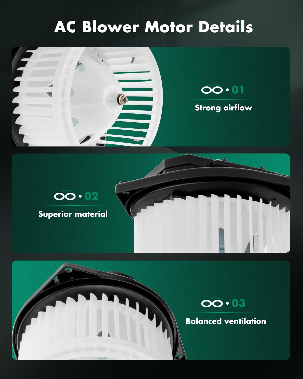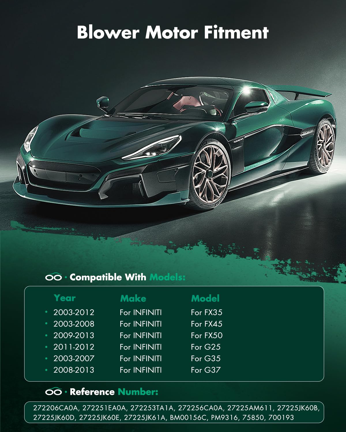 FITMENT: The Heater Blower Motor fit for 2008-2012 for Infiniti EX35 /2003-2012 for Infiniti FX35 /2013 for Infiniti FX37 /2003-2008 for Infiniti FX45 /2009-2013 for Infiniti FX50 /2011-2012 for Infiniti G25 /2003-2007 for Infiniti G35 /2008-2013 for Infiniti G37 /2013 for Infiniti JX35 /2006-2010 for Infiniti M35 /2003-2004, 2006-2010 for Infiniti M45 /2002-2006 for Infiniti Q45 /2014-2016 for Infiniti Q50 /2014-2015 for Infiniti Q60 /2014-2016 for Infiniti QX60 /2014-2016 for Infiniti QX70 | OE REPLACES PART NUMBER: # 27200-JA000, 27225-3TA1A, 27225-AM611, 27225-JK60B, 27225-JK60E, 27225JK61A, 75850, PM9316, 700193.( While this is not a genuine OEM part, it is a direct replacement ) | ADVANTAGE OF THE MOTOR: Wind power strong and No noise. Adopt new technology and excellent production equipment to make products more environmentally friendly and energy-saving. | FEATURE OF THE MOTOR: Permanently lubricated self-aligning bearings with long design life and reliable performance. This high quality blower motor is a new aftermarket replacement part built on the most stringent quality control standards. | PREFERRED MATERIAL: Superior materials which provide maximum strength and durability. Material of rotor punching plate is silicon steel sheet. Enameled wire is used copper enameled wire.