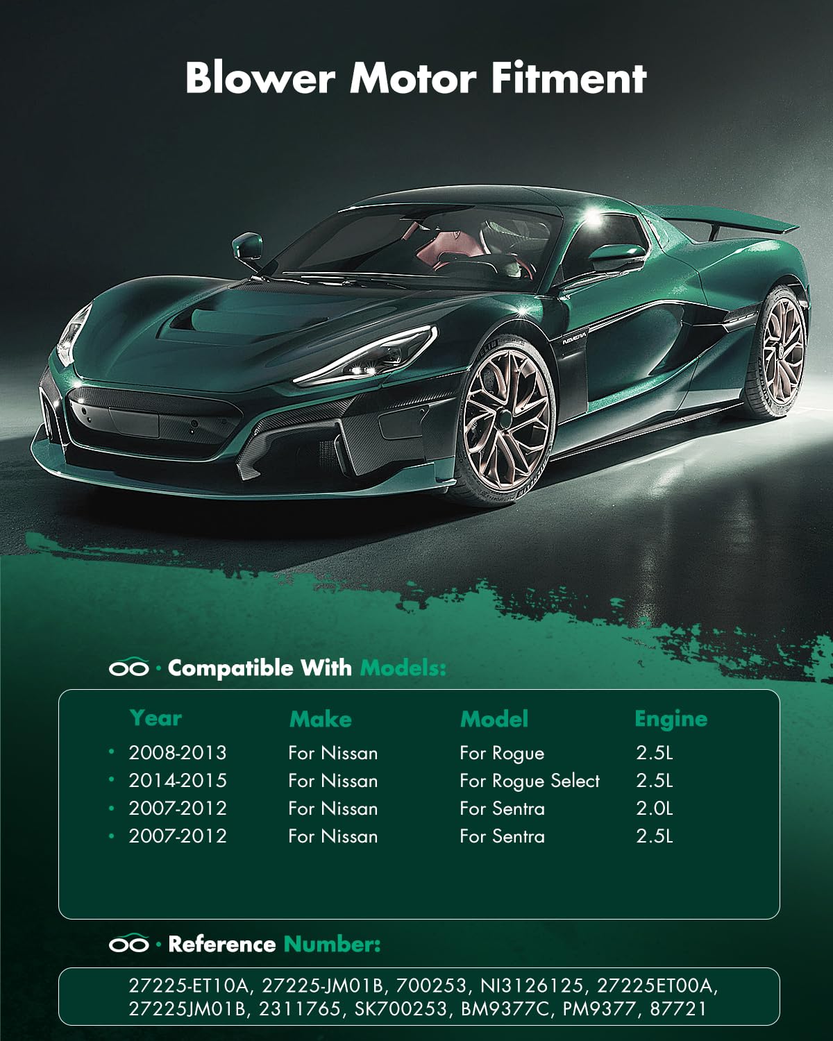 About Heater Fan Blower Resistor Replacement Motor THE OEM RESISTOR BLOWER - 27225-ET10A, 27225-JM01B, 615-50140, 615-50176, 615-58701, 27225EN000, 27225ET00A, 27225JM00A, 27225JM01A Fan Blower Motor Compatibilities for Nissan for Rogue Select S Sport Utility 4-Door 2014-2015 (Front)for Nissan for Sentra 2007-2012 (Front)for Nissan for Rogue ALL 2008-2015 (Front)Package Includes1 Fan Blower Motor