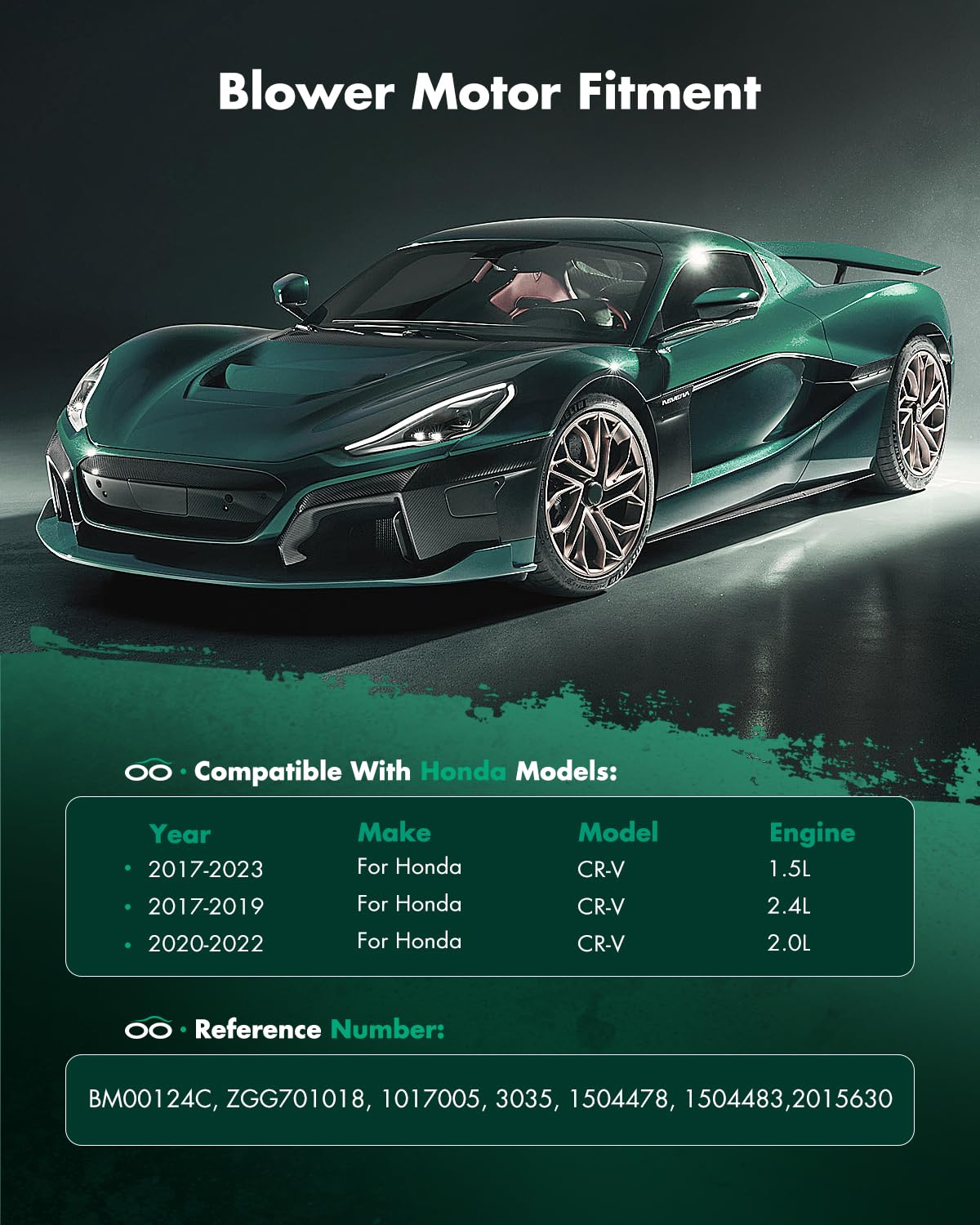 About Front HVAC Fan Blower Replacement Motor AC Fan Blower Motor compatibles with - 2021-2022 for Honda CR-V Black Edition Sport Utility 4-Door2017-2023 for Honda CR-V EX Sport Utility 4-Door2017-2023 for Honda CR-V EX-L Sport Utility 4-Door2020-2022 for Honda CR-V Hybrid EX Sport Utility 4-Door2020-2022 for Honda CR-V Hybrid EX-L Sport Utility 4-Door2020 for Honda CR-V Hybrid LX Sport Utility 4-Door2020-2022 for Honda CR-V Hybrid Touring Sport Utility 4-Door2017-2022 for Honda CR-V LX Sport Utility 4-Door2021-2022 for Honda CR-V Special Edition Sport Utility 4-Door2020-2022 for Honda CR-V Sport Sport Utility 4-Door2017-2022 for Honda CR-V Touring Sport Utility 4-Door2017-2022 for Honda CR-V Turbo Plus Sport Utility 4-Door2020-2022 for Honda CR-V Turbo Sport Utility 4-Door Package Includes 1 Fan Blower Motor Coutions. Please check above compatibility list to make sure it fits your vehicle and contact us - SCITOO if you have a trouble. Note: Please properly verify the Year/Make/Model before purchasing this product, in avoid of unnecessary charges.