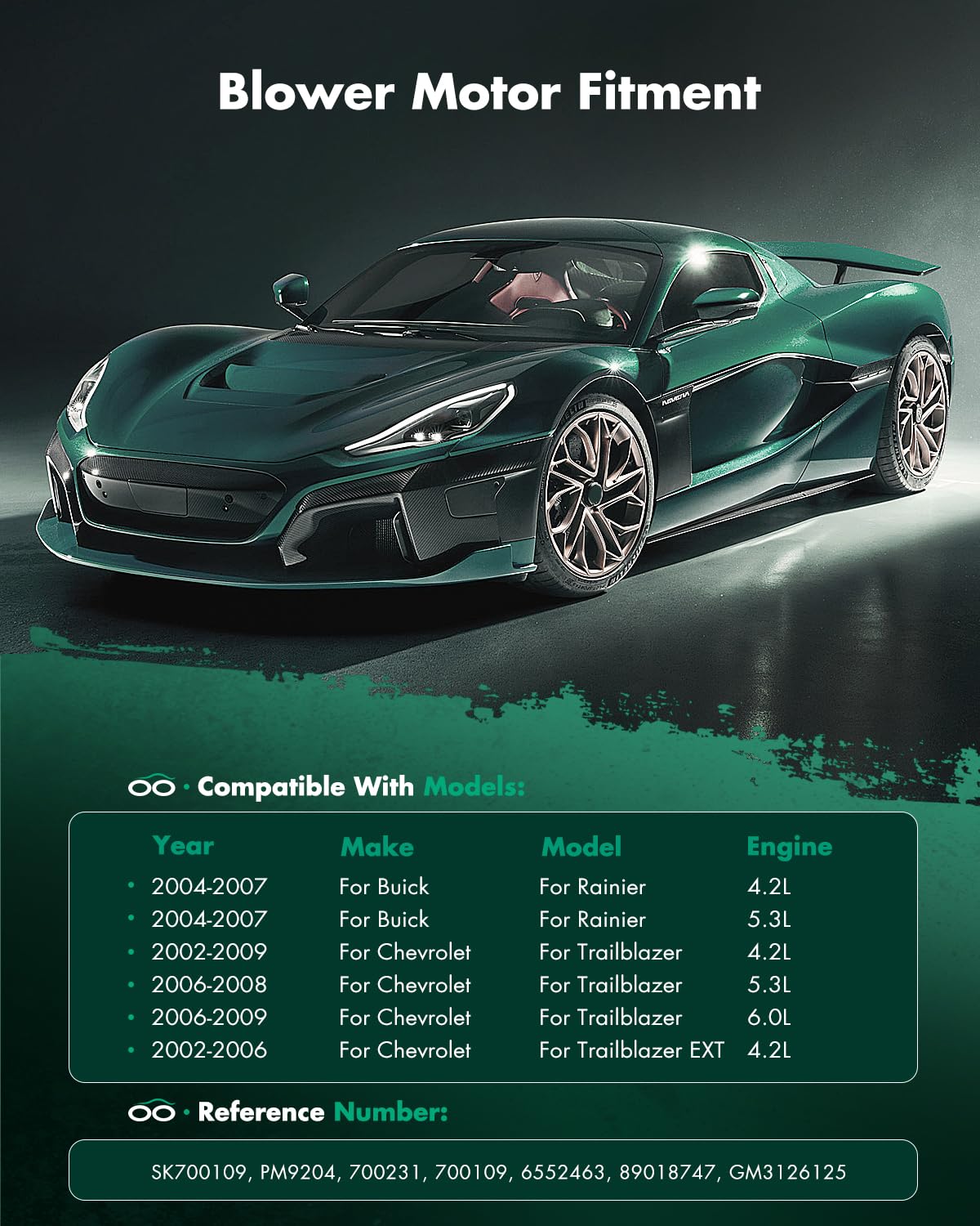 Detailed ApplicationsFront Blower MotorIncludes Fan CageDirect Replacementfitting for the following years and models: 2002-2009 for Chevy Trailblazer2002-2009 for GMC Envoy2005-2009 for Saab 9-7x2004-2007 for Buick Rainier2002-2006 for ChevyTrailblazer EXT2002-2006 for GMC Envoy XL2004-2005 for GMC Envoy XUV2002-2004 for Oldsmobile Bravada