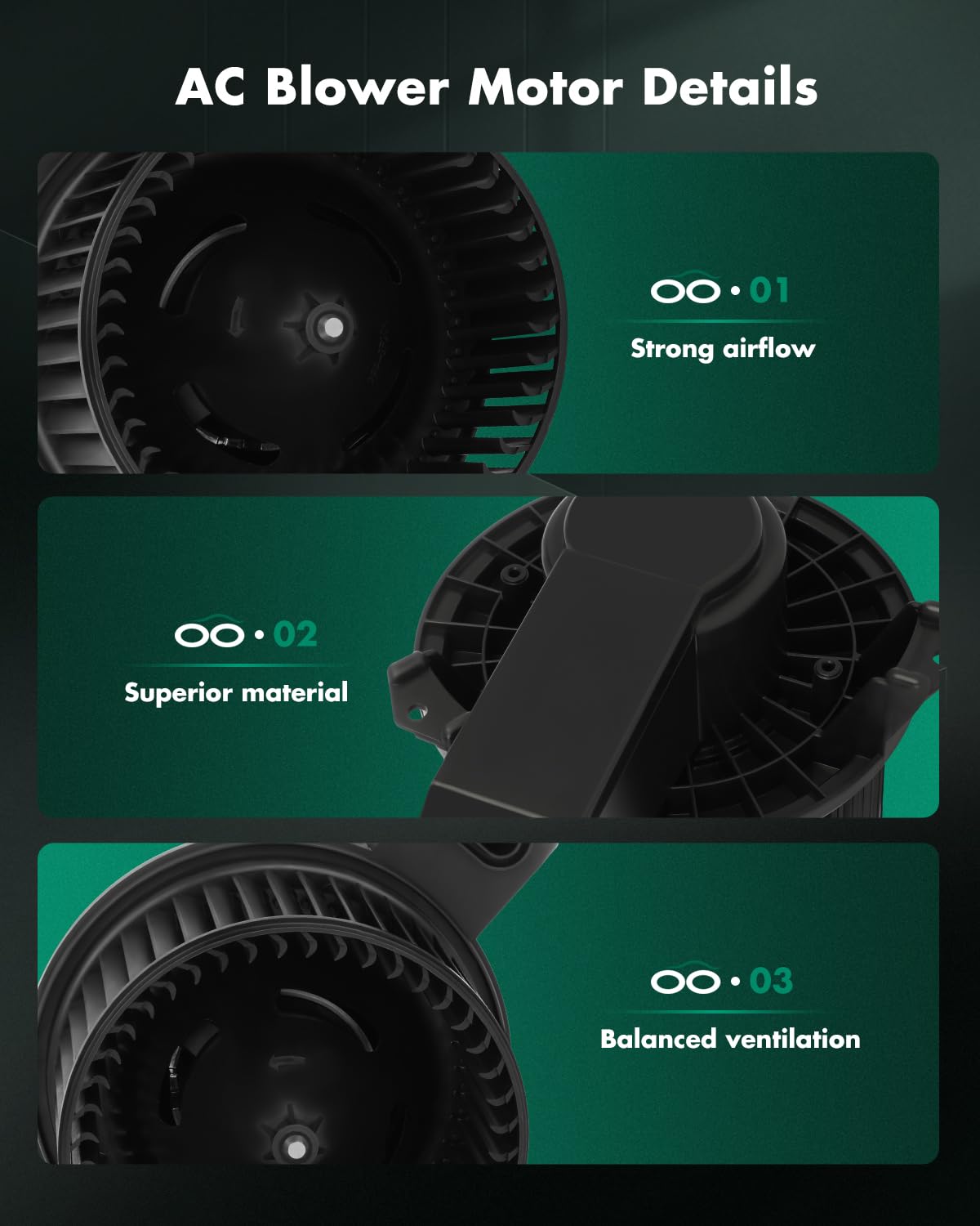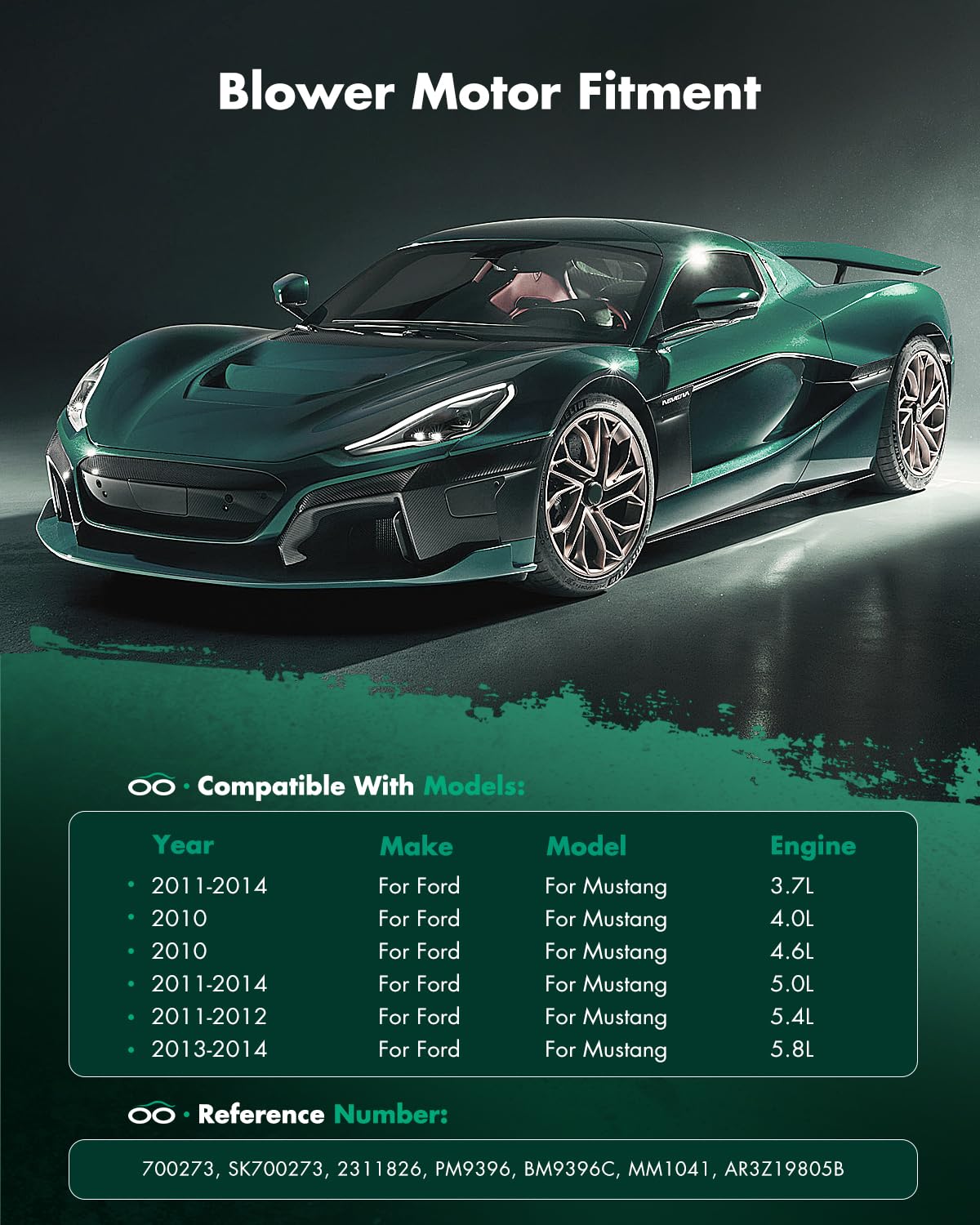 FITMENT: The Heater Blower Motor fit for 2010-2014 for Ford Mustang Base Convertible/2010-2014 for Ford Mustang Base Coupe/2012-2013 for Ford Mustang Boss 302 Coupe/2010-2014 for Ford Mustang GT Convertible/2010-2014 for Ford Mustang GT Coupe/2010-2014 for Ford Mustang Shelby Convertible/2010-2014 for Ford Mustang Shelby Coupe/2010-2014 for Ford Mustang Shelby GT500 Convertible/2010-2014 for Ford Mustang Shelby GT500 Coupe/2012,2014 for Ford Mustang ST Coupe | OEM Replace Part Number: 700273, AR3Z 19805 B, MM1041, PM9396, FO3126142, 75870 ( While this is not a genuine OEM part, it is a direct replacement ) | ADVANTAGE OF THE MOTOR: Wind power strong and No noise. Adopt new technology and excellent production equipment to make products more environmentally friendly and energy-saving. | FEATURE OF THE MOTOR: Permanently lubricated self-aligning bearings with long design life and reliable performance. This high quality blower motor is a new aftermarket replacement part built on the most stringent quality control standards. | PREFERRED MATERIAL: Superior materials which provide maximum strength and durability. Material of rotor punching plate is silicon steel sheet. Enameled wire is used copper enameled wire.