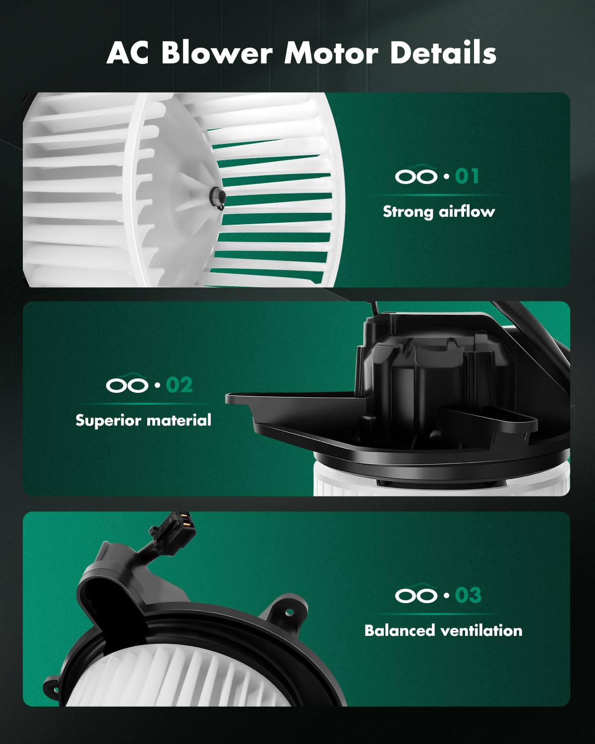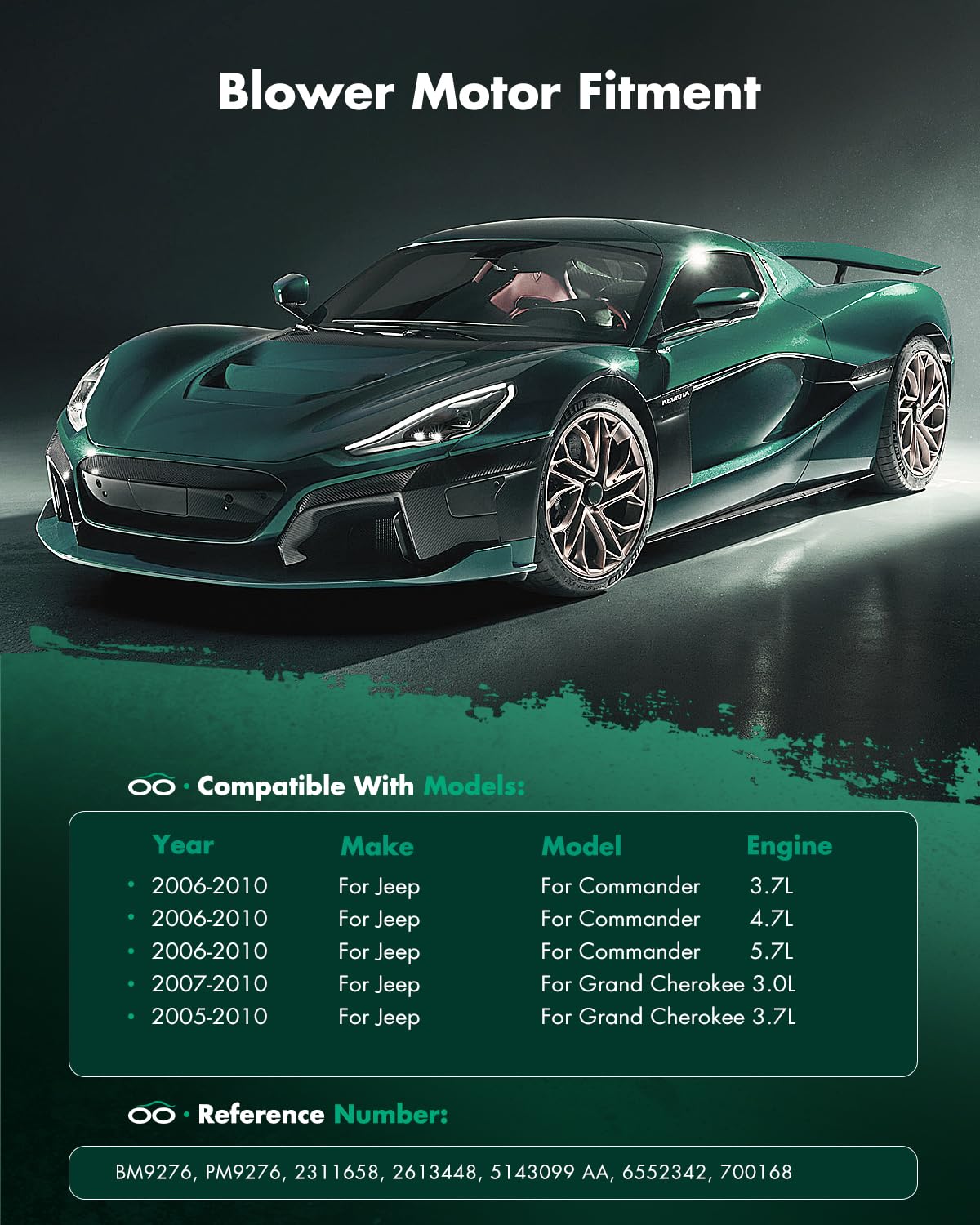 [Compatibility]: Ac Blower Motor For Jeep For Commander V6 3.7L 2006-2007,For Jeep For Commander V8 4.7L 2006-2007,For Jeep For Commander V8 5.7L 2006-2007,For Jeep For Grand Cherokee V6 3.0L 2007-2010,For Jeep For Grand Cherokee V6 3.7L 2005-2010,For Jeep For Grand Cherokee V8 4.7L 2005-2010,For Jeep For Grand Cherokee V8 5.7L 2005-2010,For Jeep For Grand Cherokee V8 6.1L 2006-2010 | [Product Specifications]: 1X Front Hvac Blower Motor With Fan Cage - ?Placement On Vehicle: Front;?Style: Flanged;?Vented: Vented;?Material: Plastic;?Flanged End: Yes;?Number Of Terminals: 2 Blades;?Working Voltage: 12V;?Connector Gender: Male;?Cage Wheel Included: W/ Wheel | [Replace Oe Number]: Bm9276, Pm9276, 2311658, 2613448, 5143099 Aa, 6552342, 700168 | [Advatage Of The Motor]: Wind Power Strong And No Noise. Adopt New Technology And Excellent Production Equipment To Make Products More Environmentally Friendly And Energy-Saving | [Multiple Speed Settings]: Customize The Airflow According To Your Needs With A Wide Range Of Speed Settings. You'Re In Full Control Of Your Comfort