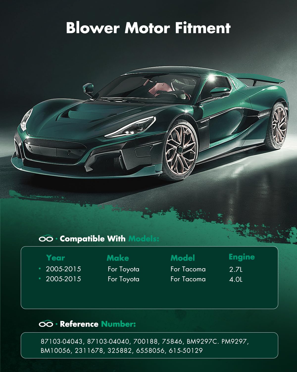 ?Fitment?The Heater Blower Motor Fit For 2005, 2006, 2007, 2008, 2009, 2010, 2011, 2012, 2013, 2014, 2015 Toyota Tacoma | ?Replace Part Number?700188, 87103-04043, 87103-04044, 87103-0C051, 75846, Pm9297, To3126117, 615-50129, Pm9297 | ?Advantage Of The Motor?Wind Power Strong And No Noise. Adopt New Technology And Excellent Production Equipment To Make Products More Environmentally Friendly And Energy-Saving. | ?Feature Of The Motor?Permanently Lubricated Self-Aligning Bearings With Long Design Life And Reliable Performance. This High Quality Blower Motor Is A New Aftermarket Replacement Part Built On The Most Stringent Quality Control Standards. | ?Preferred Material?Superior Materials Which Provide Maximum Strength And Durability. Material Of Rotor Punching Plate Is Silicon Steel Sheet. Enameled Wire Is Used Copper Enameled Wire.