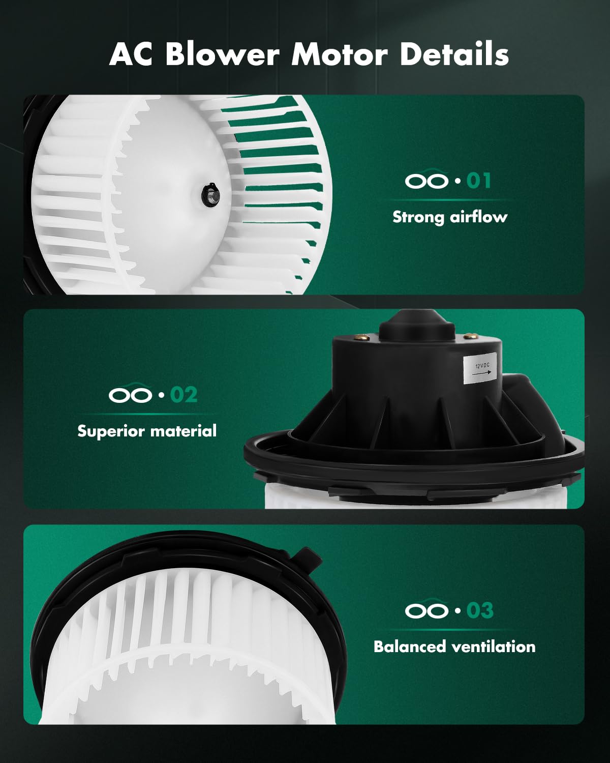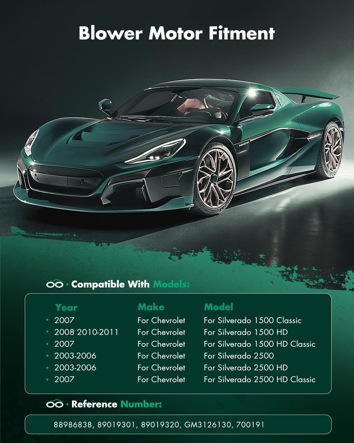 [Compatibility-1]: AC Blower Motor For Cadillac For Escalade EXT 2003-2006,For Chevrolet For Avalanche 1500 2003-2006,For Chevrolet For Avalanche 2500 2003-2006,For Chevrolet For Silverado 1500 2003-2006,For Chevrolet For Silverado 1500 Classic 2007,For Chevrolet For Silverado 1500 HD 2003 2005-2006,For Chevrolet For Silverado 1500 HD Classic 2007,For Chevrolet For Silverado 2500 2003-2006,For Chevrolet For Silverado 2500 HD 2003-2006,For Chevrolet For Silverado 2500 HD Classic 2007 | [Compatibility-2]: For Chevrolet For Silverado 3500 2003-2006,For Chevrolet For Silverado 3500 Classic 2007,For GMC For Sierra 1500 2003-2006,For GMC For Sierra 1500 Classic 2007,For GMC For Sierra 1500 HD 2003 2005-2006,For GMC For Sierra 1500 HD Classic 2007,For GMC For Sierra 2500 2003-2004,For GMC For Sierra 2500 HD 2003-2006,For GMC For Sierra 2500 HD Classic 2007,For GMC For Sierra 3500 2003-2006,For GMC For Sierra 3500 Classic 2007,For Hummer For H2 2003-2007 | [Product Specifications]: 1x Front HVAC Blower Motor with Fan Cage - ?Placement on Vehicle: Front;?Material: Metal;?Connector Gender: Female;?Number of Terminals: 2;?Terminal Type: Blade;?Flanged Mount: Yes;?Vented: Yes;?Blower Wheel Included: Yes;?Shaft Type: Single Shaft;?Working Voltage: 12V | [Replace OE Number]: 89019320, 88986838, 89023346, 700101, 15-80387, PM9201 | [Advatage of The Motor]: Wind power strong and No noise. Adopt new technology and excellent production equipment to make products more environmentally friendly and energy-saving