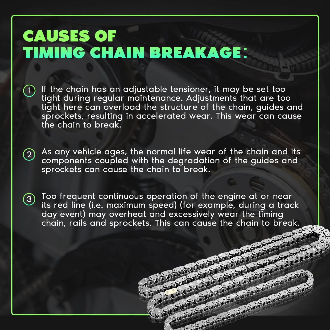 Q: What should I consider when installing the timing chain kit?A: When installing the timing chain kit, ensure that you follow the manufacturer's guidelines for torque specifications and installation procedures. It is advised to have a professional mechanic perform the installation if you are not experienced.