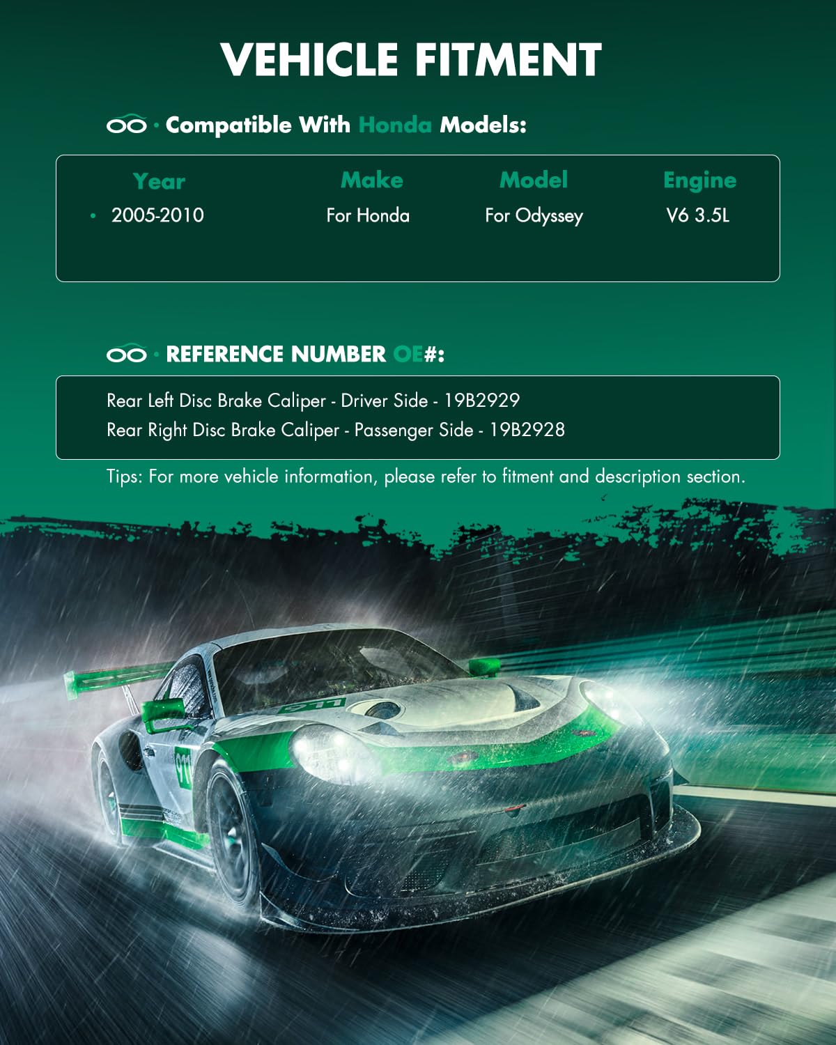 Brake Calipers: Bracket: withInlet Port Size: M10*1.25Bleeder Port Size: M10*1.0Piston Size: 40.4mmBrake Piston Count: 1PistonPiston Material: IronCaliper Finish: Zinc PlatedInterchange Part Number: Rear Left Disc Brake Caliper - Driver Side - 19B2929Rear Right Disc Brake Caliper - Passenger Side - 19B2928Package Includes: 2 x Brake CalipersCompatible with: For Honda Odyssey DX Mini Passenger Van 4-Door 3.5L 2008-2010For Honda Odyssey EX Mini Passenger Van 4-Door 3.5L 2006-2010For Honda Odyssey EX Mini Passenger Van 5-Door 3.5L 2005For Honda Odyssey EX-L Mini Passenger Van 4-Door 3.5L 2006-2010For Honda Odyssey EX-L Mini Passenger Van 5-Door 3.5L 2005For Honda Odyssey LX Mini Passenger Van 4-Door 3.5L 2006-2010For Honda Odyssey LX Mini Passenger Van 5-Door 3.5L 2005For Honda Odyssey NHL SE Mini Passenger Van 4-Door 3.5L 2010For Honda Odyssey Touring Mini Passenger Van 4-Door 3.5L 2006-2010For Honda Odyssey Touring Mini Passenger Van 5-Door 3.5L 2005