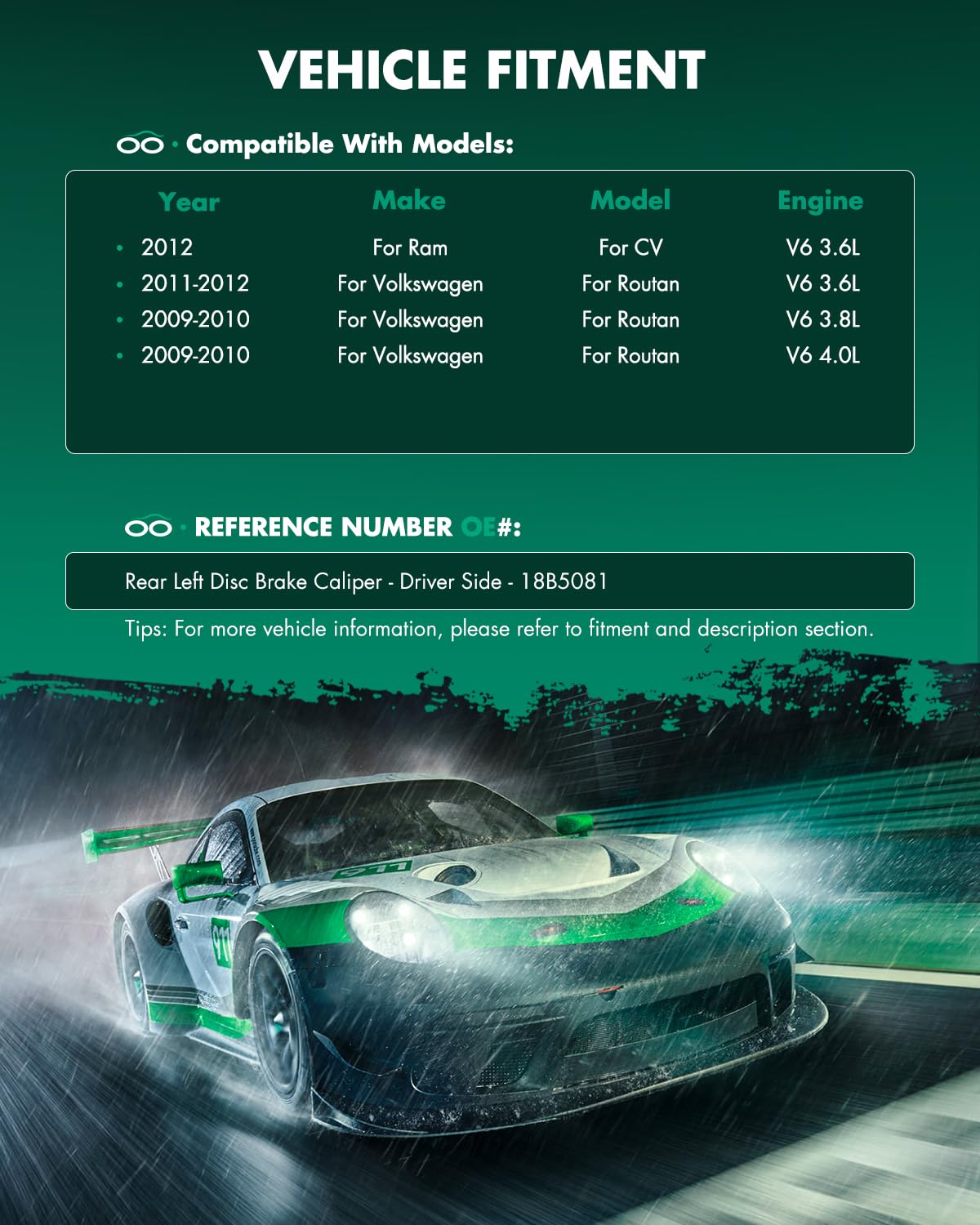 Specification:Placement on Vehicle: Rear Left (Driver Side)Brake Calipers:Bracket: withInlet Port Size: M10 x 1.0Bleeder Port Size: M10 x 1.0Piston Size: 42.8mmBrake Piston Count: 1 PistonPiston Material: MetalCaliper Finish: White ZincificationInterchange Part Number: 18B5081Package Includes: 1 x Brake CaliperCompatible with:(For More Details, Please Check ''FITMENT'' in the Upper Left Corner)For Chrysler Town & Country 2008-2012For Dodge Grand Caravan 2008-2012For Ram C/V 2012For VolkswagenFor Routan 2009-2012