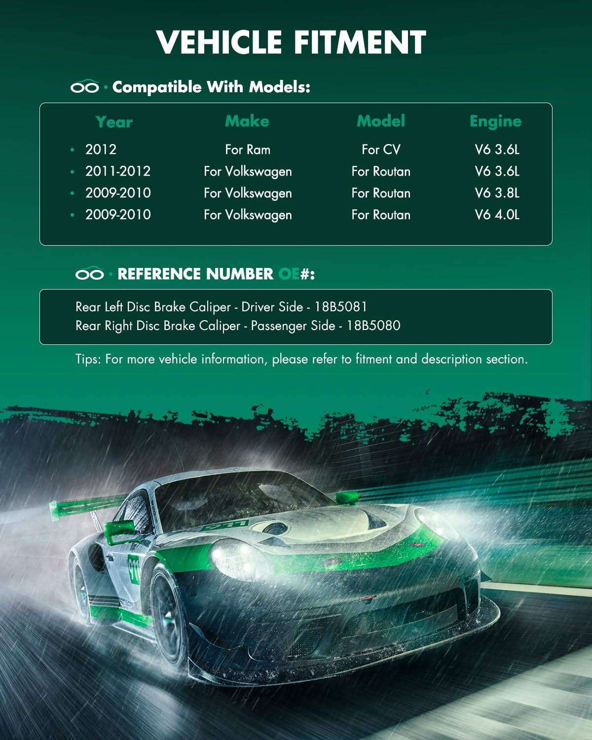 Specification:Placement on Vehicle: Rear Left and Right (Driver and Passenger Side)Brake Calipers:Bracket: withInlet Port Size: M10 x 1.0Bleeder Port Size: M10 x 1.0Piston Size: 42.8mmBrake Piston Count: 1 PistonPiston Material: MetalCaliper Finish: White ZincificationInterchange Part Number:Rear Left Disc Brake Caliper - Driver Side - 18B5081Rear Right Disc Brake Caliper - Passenger Side - 18B5080Package Includes: 2 x Brake CalipersCompatible with:(For More Details, Please Check ''FITMENT'' in the Upper Left Corner)For Chrysler Town & Country 2008-2012For Dodge Grand Caravan 2008-2012For Ram C/V 2012For VolkswagenFor Routan 2009-2012